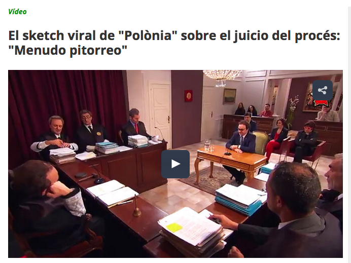 La décapante émission satirique "Polònia", habituellement en catalan mais faisant cette fois exception en faveur de l'espagnol, a, dans son numéro consacré au procès politique du moment, procédé à un divertissant renversement de situation : à vos zygomatiques en demandant pardon aux non-hispanocomprenant-es. Il était par ailleurs important que tout-e "Espagnol-e" ait été invité-e à "se fendre la poire" sur un tel sujet sensible !