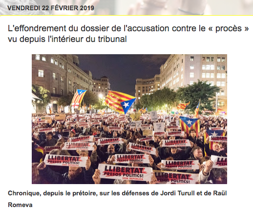 […] Les avocats de la défense n'en revenaient pas. Sous sa barbe, Me Salellas esquissait même un sourire en voyant comment le procureur s'engageait tout seul dans une impasse. De l'autre côté de la salle, les accusations avaient l'air très mécontentes. En particulier les deux avocats de Vox [extrême droite], gominés, secs, l'air sévère, réduits au silence toute la journée car personne ne veut entendre leur voix. Javier Ortega Smith a les yeux rivés sur l'écran de son téléphone portable ou sur ses papiers, la tête appuyée sur sa main gauche, exhibant le bracelet avec le drapeau espagnol. L'une des rares fois où il a relevé la tête, c'est quand Raül Romeva a dénoncé devant le tribunal le paradoxe suivant qui est une véritable honte : comment est-il possible que quelqu'un comme lui ou comme l'ensemble des autres accusés, défenseurs des droits de l'homme et des valeurs européennes, ayant toujours soutenu un militantisme politique pacifique et non violent, se trouvent sur le banc des accusés pendant que ce système judiciaire permet qu'un parti politique porteur d'idées totalement à l'opposé des leurs, niant le droit à la différence et peu préoccupé de défendre les droits civils des citoyens et les valeurs européennes se trouve, lui, sur le banc de l'accusation. L'énumération par Romeva de sa trajectoire personnelle, de son engagement dans des mouvements sociaux et dans une politique en faveur de la paix et des droits humains a donné des frissons au public. Nous ressentions tous des frissons à l'entendre parler là, tout en sachant que depuis un an il est emprisonné, accusé d'avoir fomenté un soulèvement violent inexistant. L'article intégral