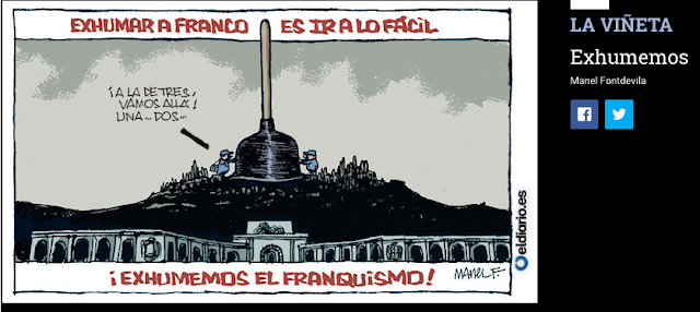 Le Gouvernement espagnol semble décidé à extraire les restes de Franco du mausolée où il lui est toujours rendu hommage. C'est bien sûr une façon de faire avaler la pilule de son soutien aux incarcérations politiques des dirigeants catalans, de sa volonté de respecter les équilibres budgétaires dictés par l'UE ... mais il n'en reste pas moins qu'extirper Franco de ce lieu reste une bonne chose. Mais seulement une étape pour "défranquiser" le pays. Car il faut prendre la mesure de ce qu'a révélé au grand jour le référendum catalan du 1er octobre en faveur de la République : le régime de la démocratie-monarchiste espagnole a gardé de fortes attaches, via la Transition des années 70, avec le franquisme. La police matraquant les électeurs du référendum, est franquiste, la justice, qui met en prison des dirigeants indépendantistes (mais aussi des non-catalans !) et oblige d'autres à l'exil, renoue avec les procès politiques du franquisme. Le juge Llarena désavoué par les justices belge et allemande (bientôt écossaise) et appelant au secours l'Etat espagnol pour le protéger de la convocation devant un juge belge pour irrégularités dans son instruction des accusations des catalanistes , est un franquiste intégral. Etc. Donc oui, comme le dit et le figure si bien le dessin ci-dessus de eldiario.es sur une scène du Valle de los Caídos (la Vallée des tombés pour le franquisme) où gît le tyran, il faut en finir avec le franquisme qui est toujours là, instrumentalisé par une démocratie toujours plus autoritaire, liberticide et vouée à la défense des intérêts capitalistes reconduits eux aussi, en ligne directe, des temps de dictature.