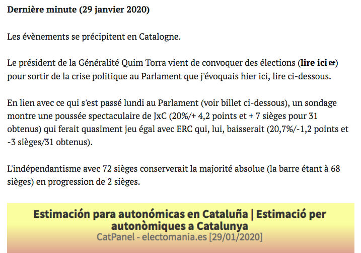 Déchu lundi de son mandat de député au parlement catalan, le président de la Généralité en appelle aux électeurs. Un premier sondage montre une forte redistribution des cartes dans un indépendantisme fracturé par ce qui s'est passé il y a deux jours : le parti du président, JxC, ferait un spectaculaire bon en avant au détriment de son problématique partenaire, ERC.