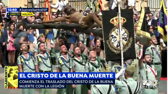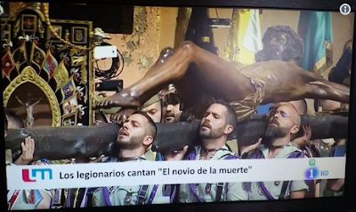 Il y en a qui pensent que cela n'a rien à voir avec ce qui se passe en Catalogne : aujourd'hui, cérémonies de Pâques obligent, tous les drapeaux espagnols sont en berne dans tous les établissements...militaires pour rendre hommage au Christ (et vive l'union du sabre et du goupillon !) . Sur la photo ci-dessus, vous voyez comment, aujourd'hui, à Málaga, en présence des autorités militaires et politiques (dont quatre ministres), la Légion (vous savez celle qui a été l'une des pièces maîtresses des franquistes pendant la Guerre Civile et qui n'a jamais été épurée, comme tant d'autres institutions !) a défilé en portant l'image du Christ mort (vidéo ici : http://vertele.eldiario.es/noticias/Marhuenda-Elisa-Espejo-Publico-Cristo_0_1998400146.html).