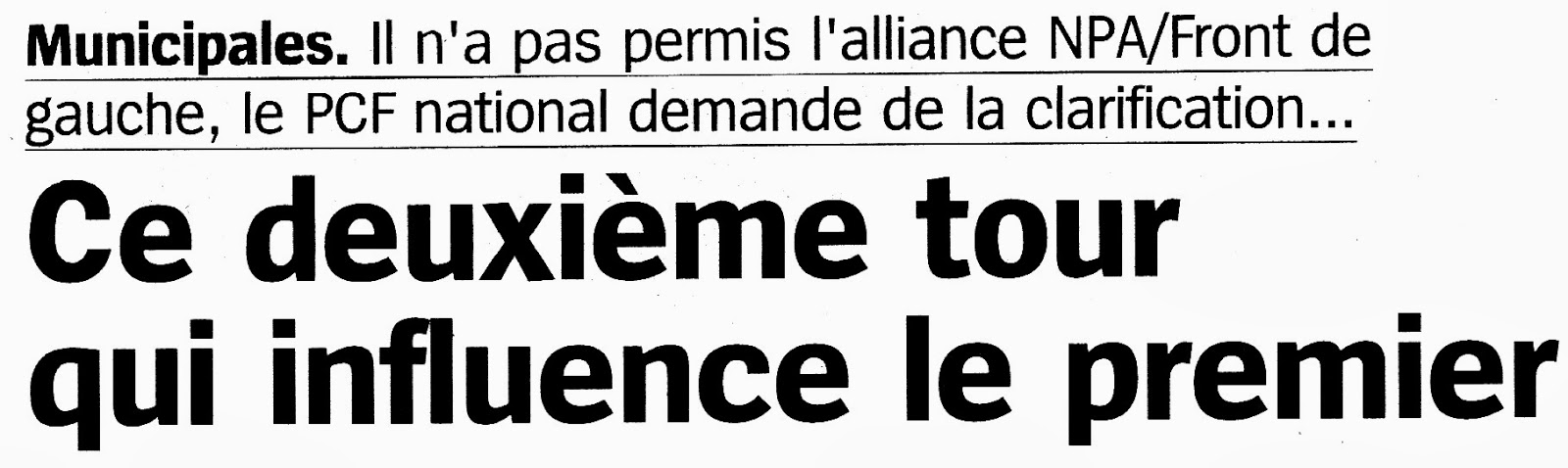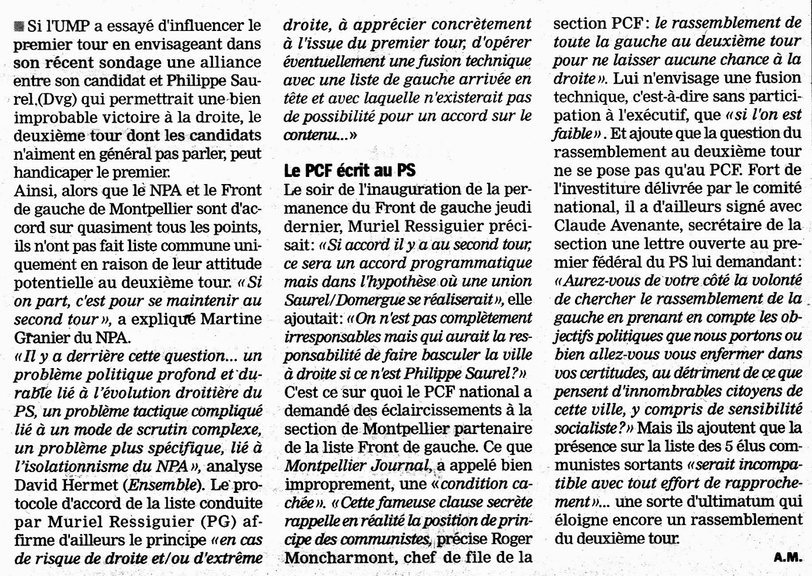 - il est fait allusion à la rupture des discussions entre le NPA et le Front de Gauche visant à constituer une liste unitaire sur Montpellier en termes suggérant une sorte d'équidistance dans la responsabilité de cette division mais cette équidistance se défait vite cependant puisque ce n'est que le point de vue du Front de Gauche qui s'exprime au long de l'article par ses représentants (Hermet, Ressiguier, Moncharmont), les propos de Martine Granier, pour le NPA, n'ayant droit qu'à 3 lignes;