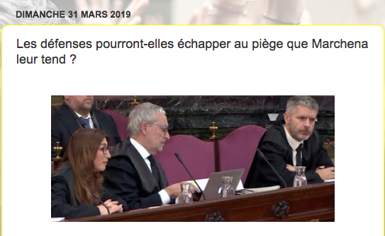 [Le président du tribunal] Marchena n'accepte pas les documents contradictoires mettant en cause la validité et la crédibilité d'un témoignage. C'est une règle fondamentale contre laquelle la plupart des avocats des accusés se sont élevés depuis le début de ce procès et que les observateurs internationaux (présents dans le public puisque l'accréditation d'observateurs leur a été refusée) qui, chaque jour assistent aux sessions, ont dénoncé. Tout au début de l'audition des témoins, Marchena avait autorisé la projection de certaines vidéos. Des images de la brutalité de la Guàrdia civil contre les gens qui allaient voter à Sant Carles de la Ràpita avaient été projetées à Mariano Rajoy [chef du gouvernement espagnol pendant le référendum d'autodétermination catalane]. Auparavant, la salle d'audience avait pu voir quinze secondes des charges de la police espagnole dans l'escalier du collège Pau Claris de Barcelone, avec les coups de pied lancés à la volée sur les gens qui s'y trouvaient.