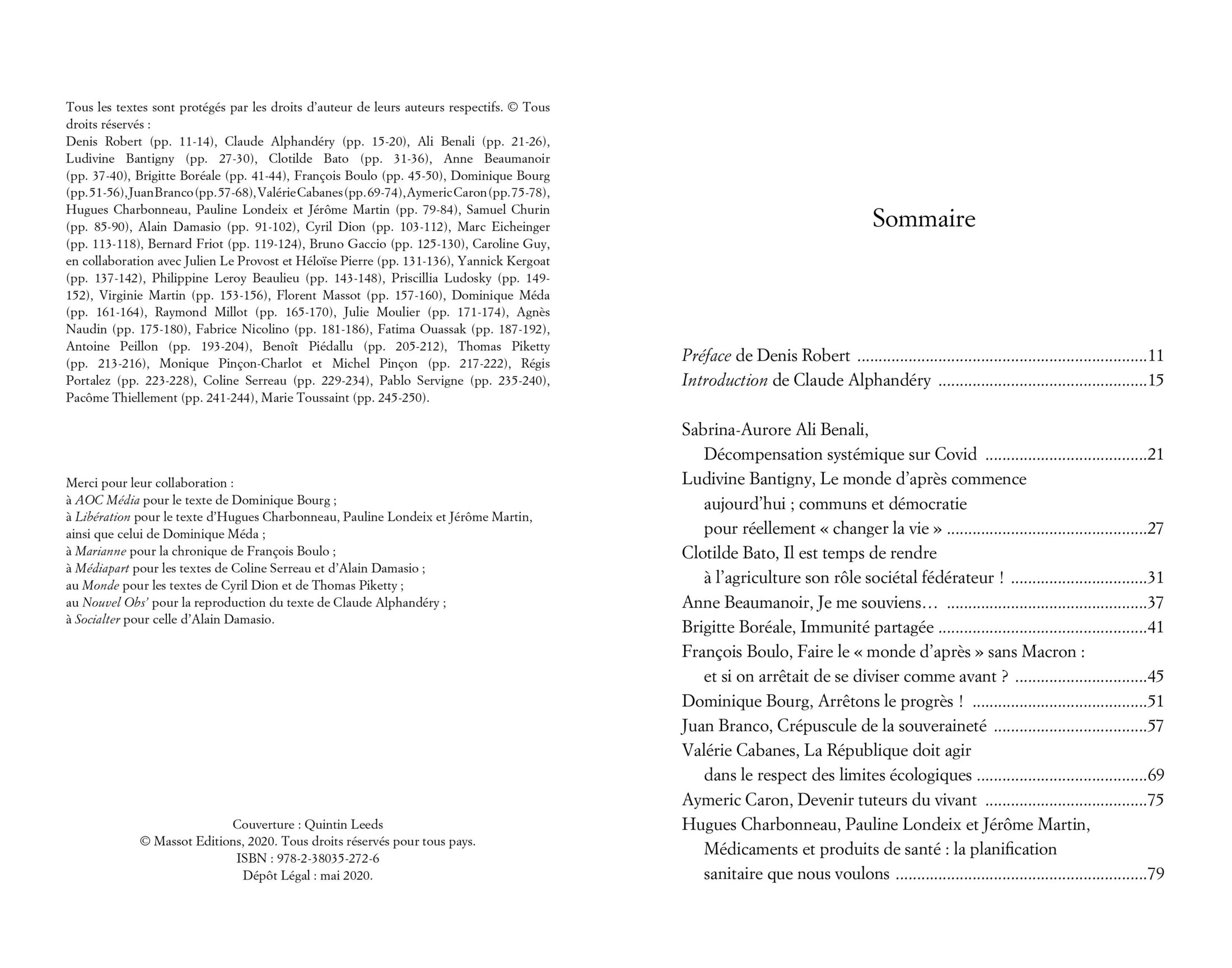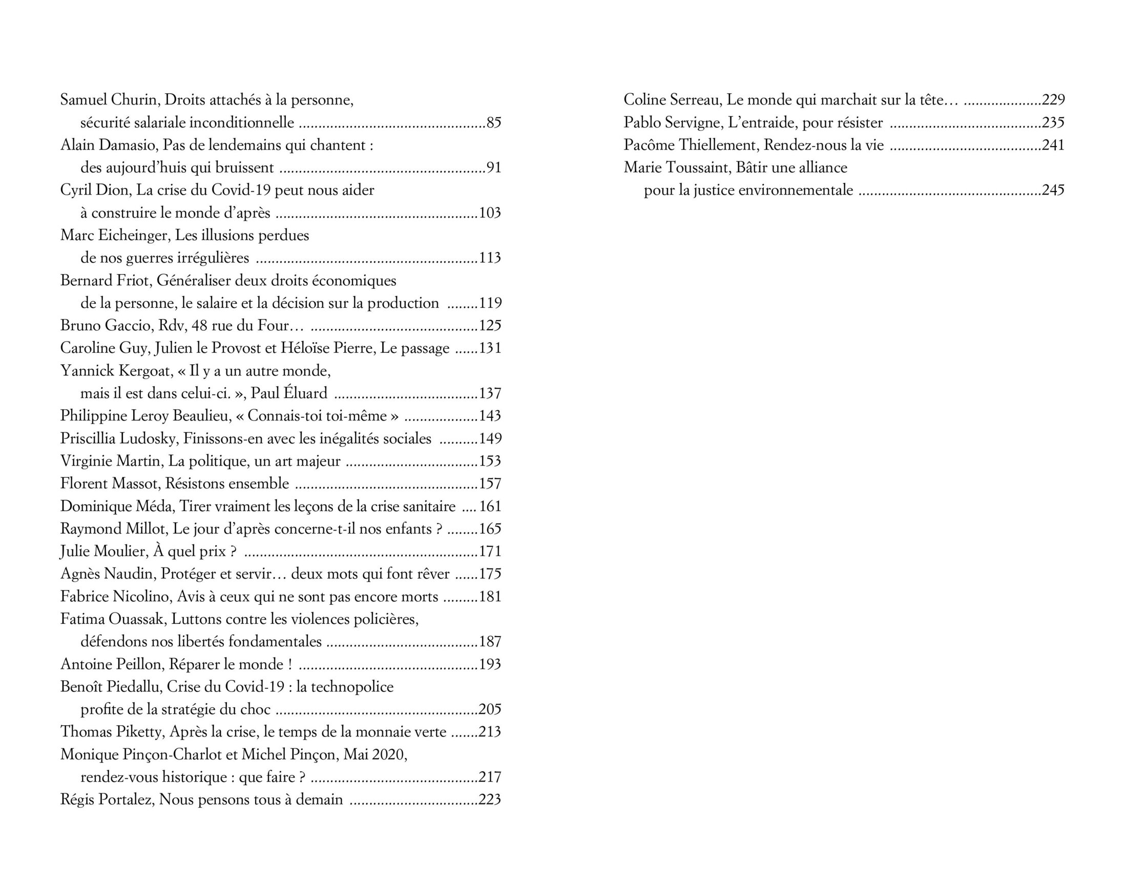 Collectif : Claude Alphandéry, Sabrina Ali Benali, Ludivine Bantigny, Clotilde Bato, Anne Beaumanoir, Brigitte Boréale, François Boulo, Dominique Bourg, Juan Branco, Valérie Cabanes, Aymeric Caron, Hugues Charbonneau, Pauline Londeix et Jérôme Martin, Samuel Churin, Alain Damasio, Cyril Dion, Marc Eichinger, Bernard Friot, Bruno Gaccio, Caroline Guy, en collaboration avec Julien Le Provost et Héloïse Pierre, Yannick Kergoat, Philippine Leroy Beaulieu, Priscillia Ludosky, Virginie Martin, Florent Massot, Dominique Méda, Raymond Millot, Julie Moulier, Agnès Naudin, Fabrice Nicolino, Fatima Ouassak, Antoine Peillon, Benoît Piédallu, Thomas Piketty, Monique et Michel Pinçon-Charlot, Régis Portalez, Denis Robert, Coline Serreau, Pablo Servigne, Pacôme Thiellement, Marie Toussaint.