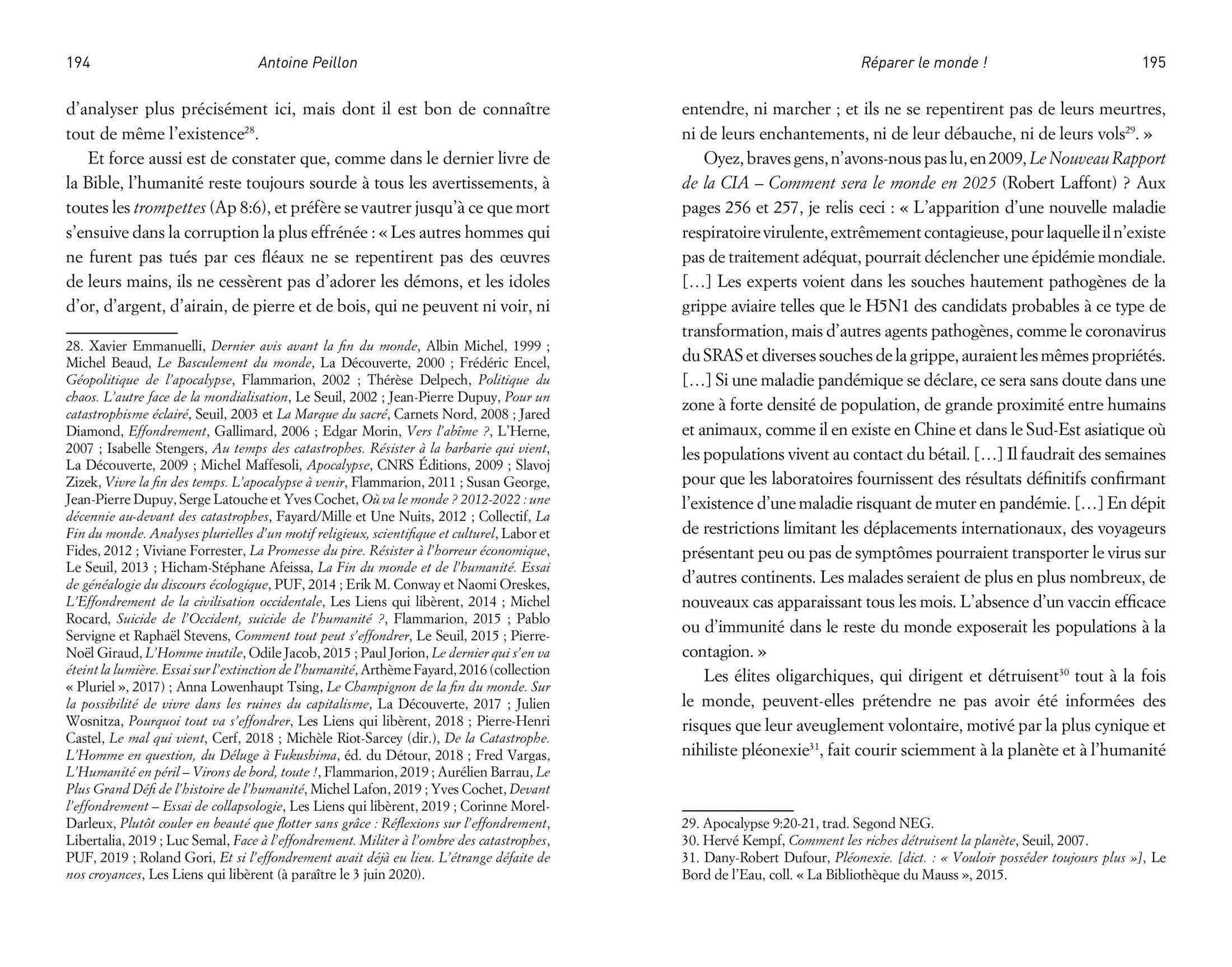 [3] Xavier Emmanuelli, Dernier avis avant la fin du monde, Albin Michel, 1999 ; Michel Beaud, Le Basculement du monde, La Découverte, 2000 ; Frédéric Encel, Géopolitique de l’apocalypse, Flammarion, 2002 ; Thérèse Delpech, Politique du chaos. L’autre face de la mondialisation, Le Seuil, 2002 ; Jean-Pierre Dupuy, Pour un catastrophisme éclairé, Seuil, 2003, puis La Marque du sacré, Carnets Nord, 2008 ; Jared Diamond, Effondrement, Gallimard, 2006 ; Edgar Morin, Vers l’abîme ?, L’Herne, 2007 ; Isabelle Stengers, Au temps des catastrophes. Résister à la barbarie qui vient, La Découverte, 2009 ; Michel Maffesoli, Apocalypse, CNRS Éditions, 2009 ; Slavoj Zizek, Vivre la fin des temps. L’apocalypse à venir, Flammarion, 2011 ; Susan George, Jean-Pierre Dupuy, Serge Latouche et Yves Cochet, Où va le monde ? 2012-2022 : une décennie au-devant des catastrophes, Fayard / Mille et une nuits, 2012 ; Collectif, La fin du monde. Analyses plurielles d’un motif religieux, scientifique et culturel, Labor Et Fides, 2012 ; Viviane Forrester, La Promesse du pire. Résister à l’horreur économique, Le Seuil, 2013 ; Hicham-Stéphane Afeissa, La fin du monde et de l’humanité. Essai de généalogie du discours écologique, PUF, 2014 ; Erik M. Conway et Naomi Oreskes, L’Effondrement de la civilisation occidentale, Les Liens qui libèrent, 2014 ; Michel Rocard, Suicide de l’Occident, suicide de l’humanité ?, Flammarion, 2015 ; Pablo Servigne et Raphaël Stevens, Comment tout peut s’effondrer, Le Seuil, 2015 ; Pierre-Noël Giraud, L’Homme inutile, Odile Jacob, 2015 ; Paul Jorion, Le dernier qui s’en va éteint la lumière. Essai sur l’extinction de l’humanité, Arthème Fayard, 2016 (collection « Pluriel », 2017) ; Anna Lowenhaupt Tsing, Le champignon de la fin du monde. Sur la possibilité de vivre dans les ruines du capitalisme, La Découverte, 2017 ; Julien Wosnitza, Pourquoi tout va s'effondrer, Les Liens qui Libèrent, 2018 ; Pierre-Henri Castel, Le mal qui vient, Cerf, 2018 ; Michèle Riot-Sarcey (dir.), De la Catastrophe. L’Homme en question, du Déluge à Fukushima, éd. du Détour, 2018 ; Fred Vargas, L'Humanité en péril - Virons de bord, toute !, Flammarion, 2019 ; Aurélien Barrau, Le plus grand défi de l'histoire de l'humanité, Michel Lafon, 2019 ; Yves Cochet, Devant l'effondrement - Essai de collapsologie, Les Liens qui Libèrent, 2019 ; Corinne Morel Darleux, Plutôt couler en beauté que flotter sans grâce : Réflexions sur l'effondrement, Libertalia, 2019 ; Luc Semal, Face à l’effondrement. Militer à l’ombre des catastrophes, PUF, 2019 ; Roland Gori, Et si l'effondrement avait déjà eu lieu. L'étrange défaite de nos croyances, Les Liens qui Libèrent (paraît le 3 juin 2020).