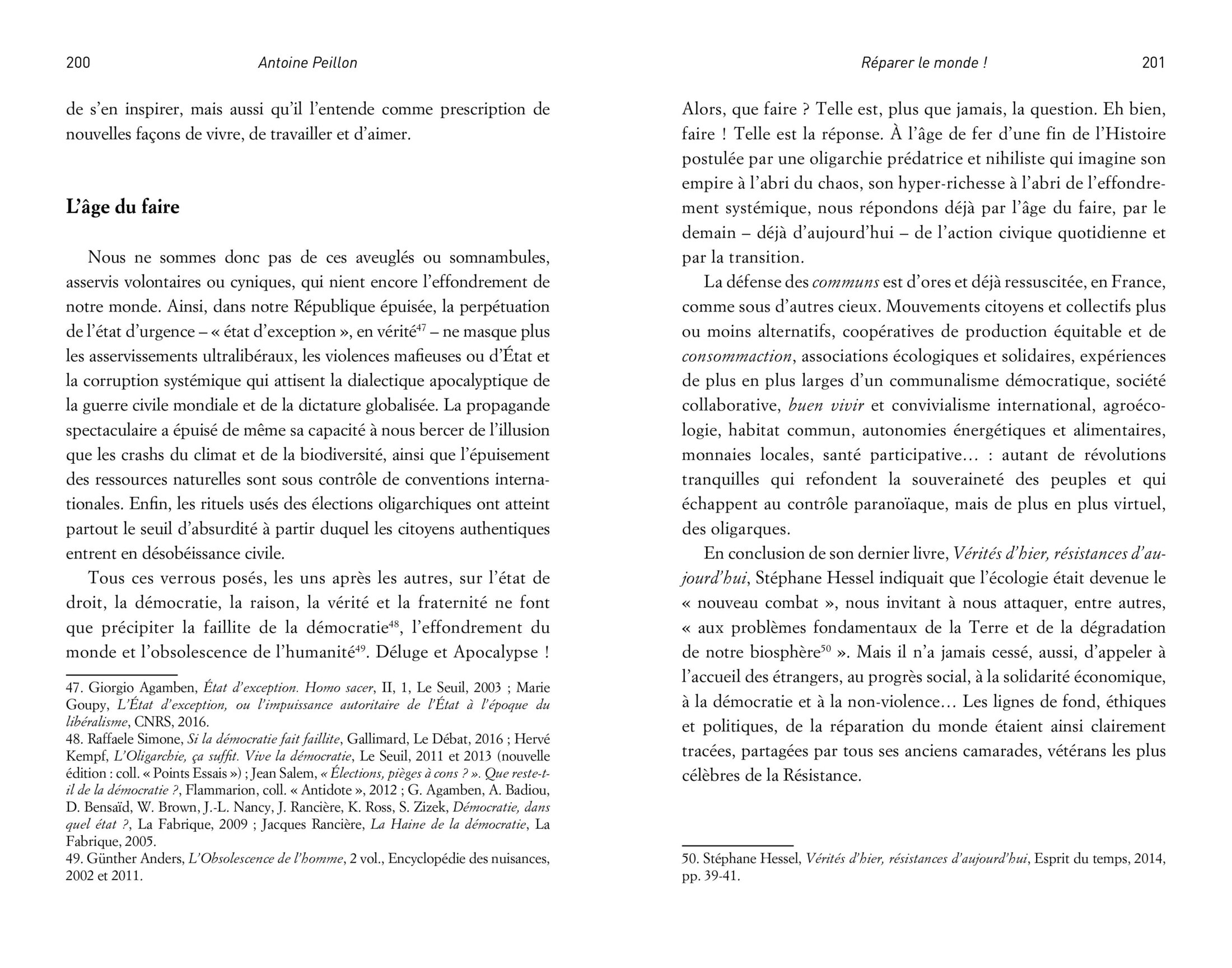 Héritiers de cette métaphysique, c'est-à-dire d'une eschatologie et d'une philosophie de l'Histoire dont Giorgio Agamben est le meilleur penseur actuel (lire ci-dessous, l'Annexe III), celles et ceux qui travaillent inlassablement à la réparation de notre monde en cours d’effondrement ouvrent aujourd’hui un nouvel espace de vie, selon les principes Espérance et Responsabilité animés en synergie[34]. Ainsi se dessine, sans complaisante béatitude, ni ruse perverse (allocution télévisée d’Emmanuel Macron, le 13 avril), un nouvel horizon de « jours heureux »[35].