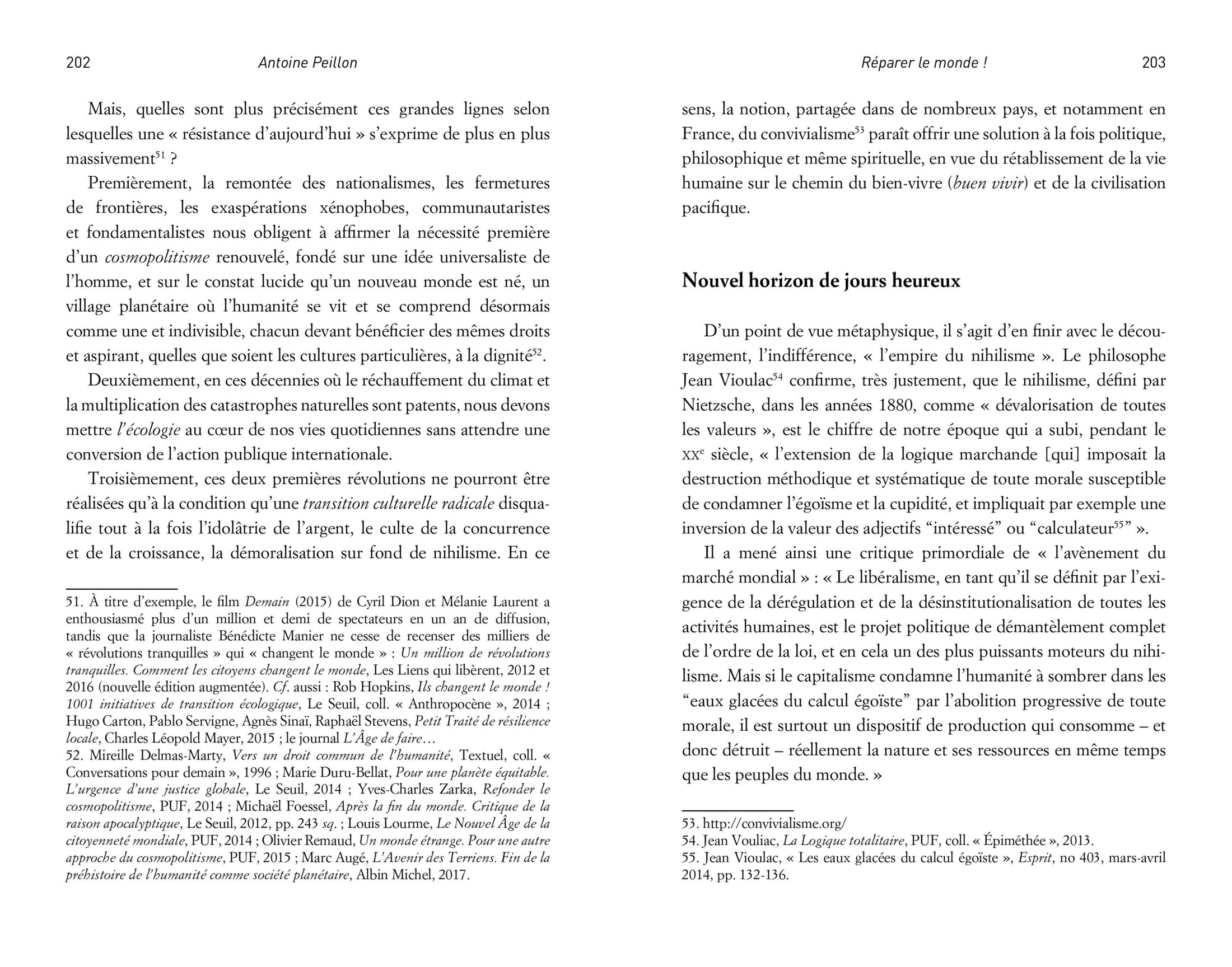 [27] A titre d’exemple, le film Demain (2015) de Cyril Dion et Mélanie Laurent a enthousiasmé plus d’un million et demi de spectateurs en un an de diffusion, tandis que la journaliste Bénédicte Manier ne cesse de recenser des milliers de « révolutions tranquilles » qui « changent le monde » : Un million de révolutions tranquilles. Comment les citoyens changent le monde, Les Liens qui libèrent, 2012 et 2016 (nouvelle édition augmentée). Cf. aussi : Rob Hopkins, Ils changent le monde ! 1001 initiatives de transition écologique, Le Seuil, collection « Anthropocène », 2014 ; Hugo Carton, Pablo Servigne, Agnès SinaÏ, Raphaël Stevens, Petit Traité de résilience locale, Editions Charles Léopold Mayer, 2015 ; le journal L’Âge de faire…