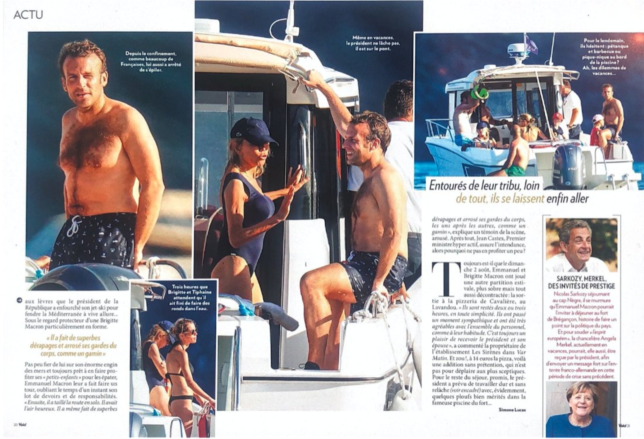 Oui, tout va bien, puisque nous apprenions alors, en exclusivité (vite relayée par presque tous les médias), que le président de la République s’était « octroyé une petite séance de jet-ski avec ses ‘‘petits-enfants’’ [ceux de Brigitte Macron, en fait], et qu’ensuite, il a taillé la route en solo » au large du fort de Brégançon. « Il avait l’air heureux. Il a même fait de superbes dérapages et arrosé ses gardes du corps les uns après les autres », a confié, de plus, « un témoin » providentiel au rigoureux tabloïd. Bien sûr, les photos étaient très réussies, presque attendrissantes. N’y voyait-on pas, sur l’une d’entre elles, un Emmanuel Macron torse nu et velu, comme s’il venait de s’évader de Koh-Lanta, gratifié de cette légende (celle de la photo) : « Depuis le confinement, comme beaucoup de Françaises (sic), lui aussi a arrêté de s’épiler » ?