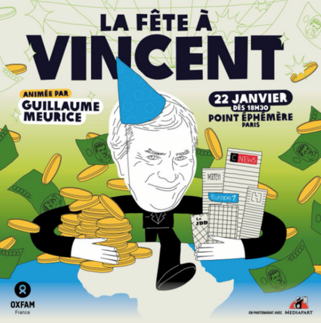 À l’occasion de la Saint Vincent, Oxfam vous invite à une soirée inédite autour de Vincent Bolloré et vous propose de se réunir pour dénoncer tout ce que représente la 8ème fortune du pays : ultra-richesse héritée en partie des ressources de l’Afrique, concentration des pouvoirs et des médias, propagation d’une idéologie d’extrême droite.