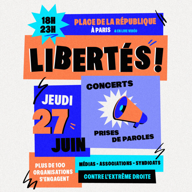 Médias indépendants, syndicats, associations de défense des droits et mouvements citoyens, nous vous invitons à participer à un grand événement public le jeudi 27 juin à 18h, Place de la République, à Paris.