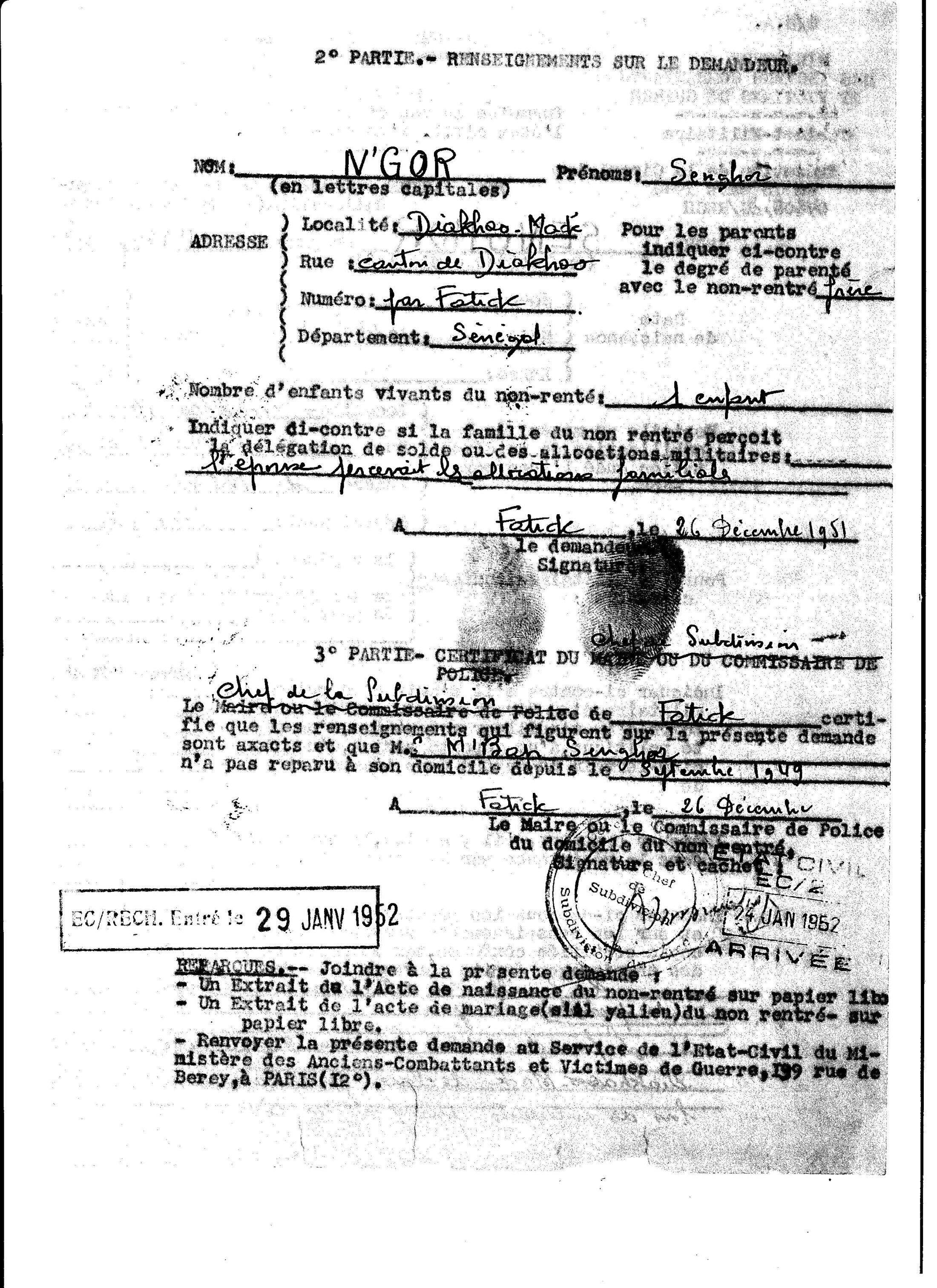 Je remarque que ce document est daté du 8 août 1952 et non 1953 et que la mairie de Fatick, inexistante en 1953, n'a jamais pu délivrer de certificat de décès et aucun acte de décès n'a été établi pour mon père. Il n'existe aucun document signé de ma mère attestant qu'elle a bien été informée de la cause du décès de son mari. Par contre, mon oncle N'Gor Senghor a fait une démarche en vue d'obtenir la régularisation de l'état-civil d'un « non-rentré ».