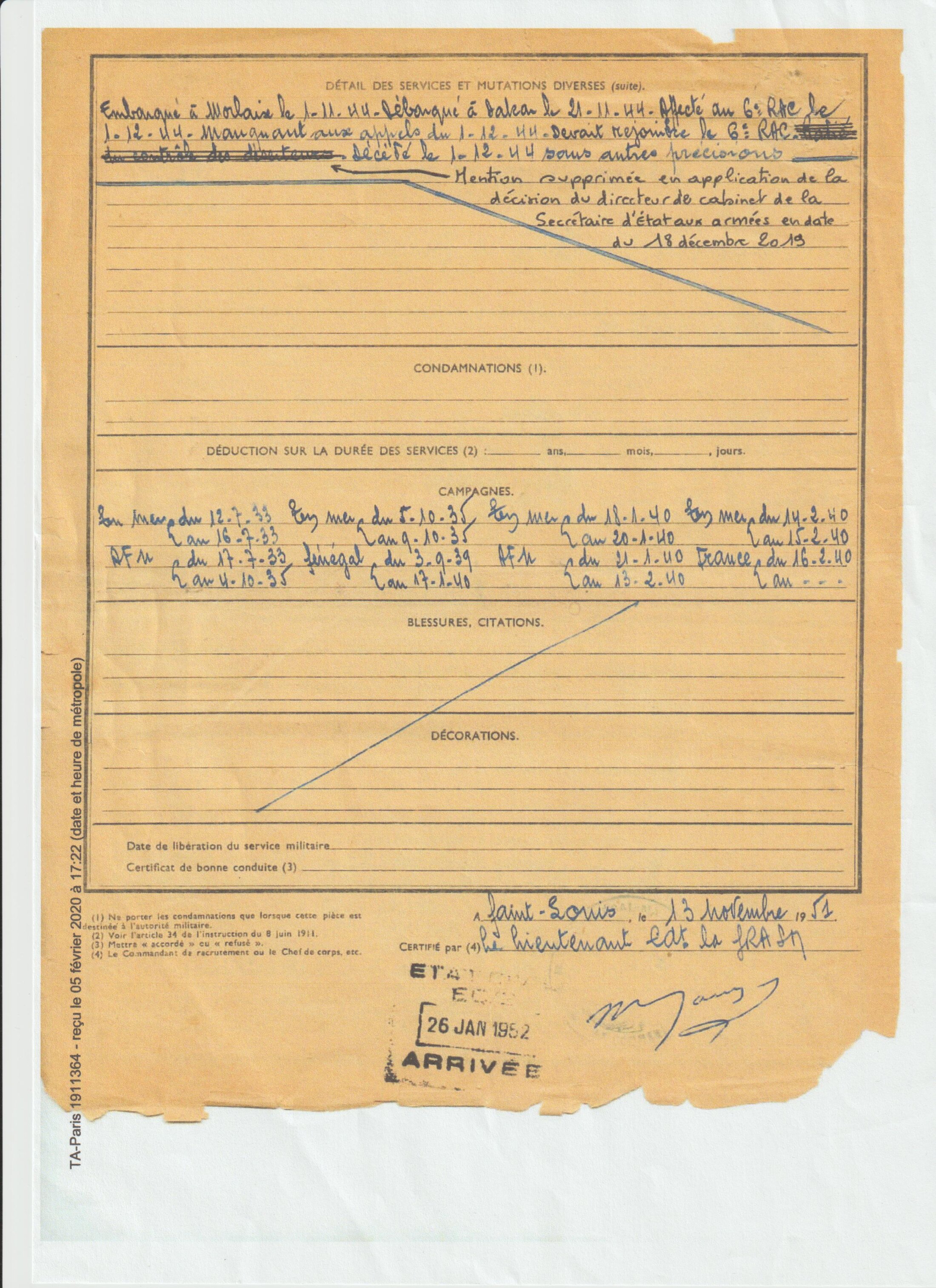 En janvier 1952, l'administration considérait mon père comme « non-rentré » mais aussi « déserteur » comme l'indique son état signalétique et des services daté du 13 novembre 1951. Le ministre de la Guerre, dans un courrier vraisemblablement rédigé en 1952, signale que mon père, ancien prisonnier de guerre, aurait été hospitalisé à Dakar dès son débarquement et qu'il manquait à l'appel du 12 décembre 1944.
