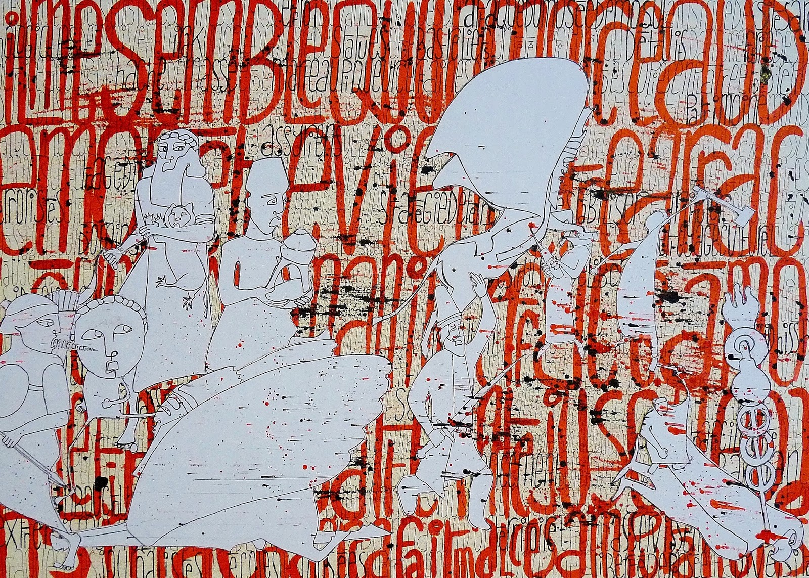 Résistance / Ishtar à Mossoul, Collage, encre, acrylique et feutre sur papier. 36 x 51 cm.