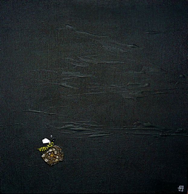 Au mur, une petite toile plus récente créée dans mon jardin de montagne, rendra hommage aux guêpes dont j’ai furieusement détruit le nid parce qu’il squattait fâcheusement ma boîte aux lettres en juillet 2014.