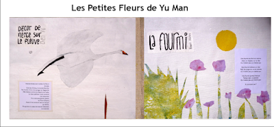 - Dans le second cas, les enfants seront invités à retrouver dans le grand livre Les Petites fleurs de Yu Man, le texte source contenant l’extrait pioché. Ils pourront alors dessiner le poème ou le conte choisi.