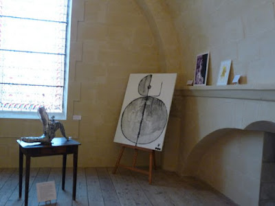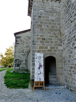 Pour l'accrochage, je fus seule dans l'église. Affairés dans l'autre salle de l'exposition Chemin de peintre à Jaillans qui accueillait douze artistes, les organisateurs Robert et Vincent s'étaient greffé le portable aux oreilles et étaient là dans les 10 minutes si besoin.