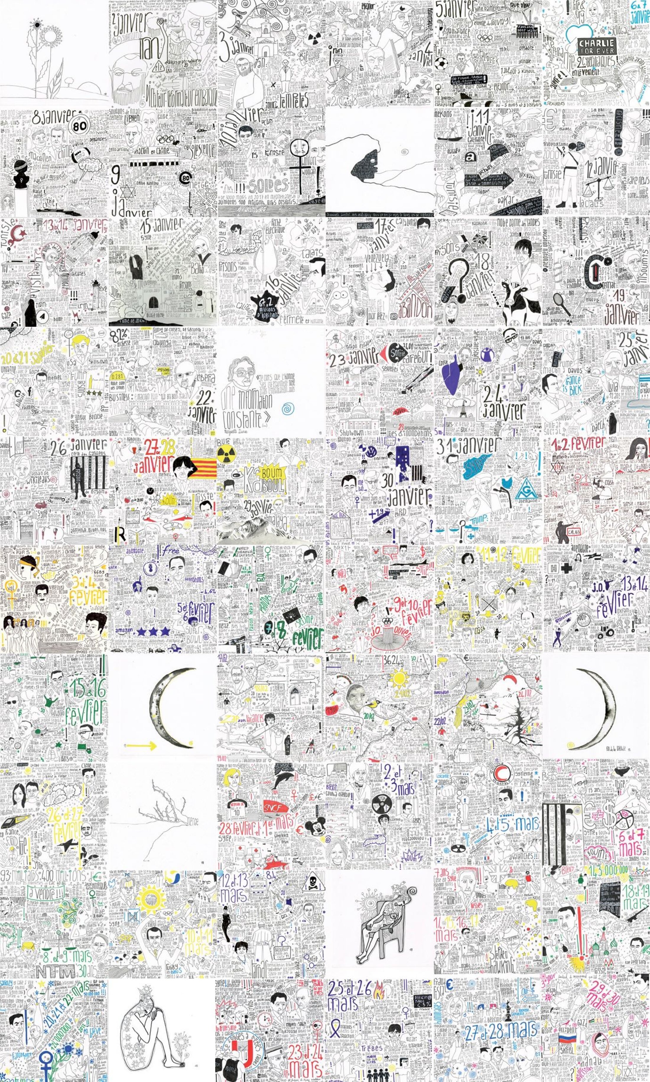 Depuis le 1er janvier, je dessine l'information en continu sur des petits formats papier (20x20cm). Voici donc deux trimestres de bouclés et un autre qui commence. Petit résumé très confusant. Vous n'y voyez plus rien ? C'est normal. C'est l'info en continu.