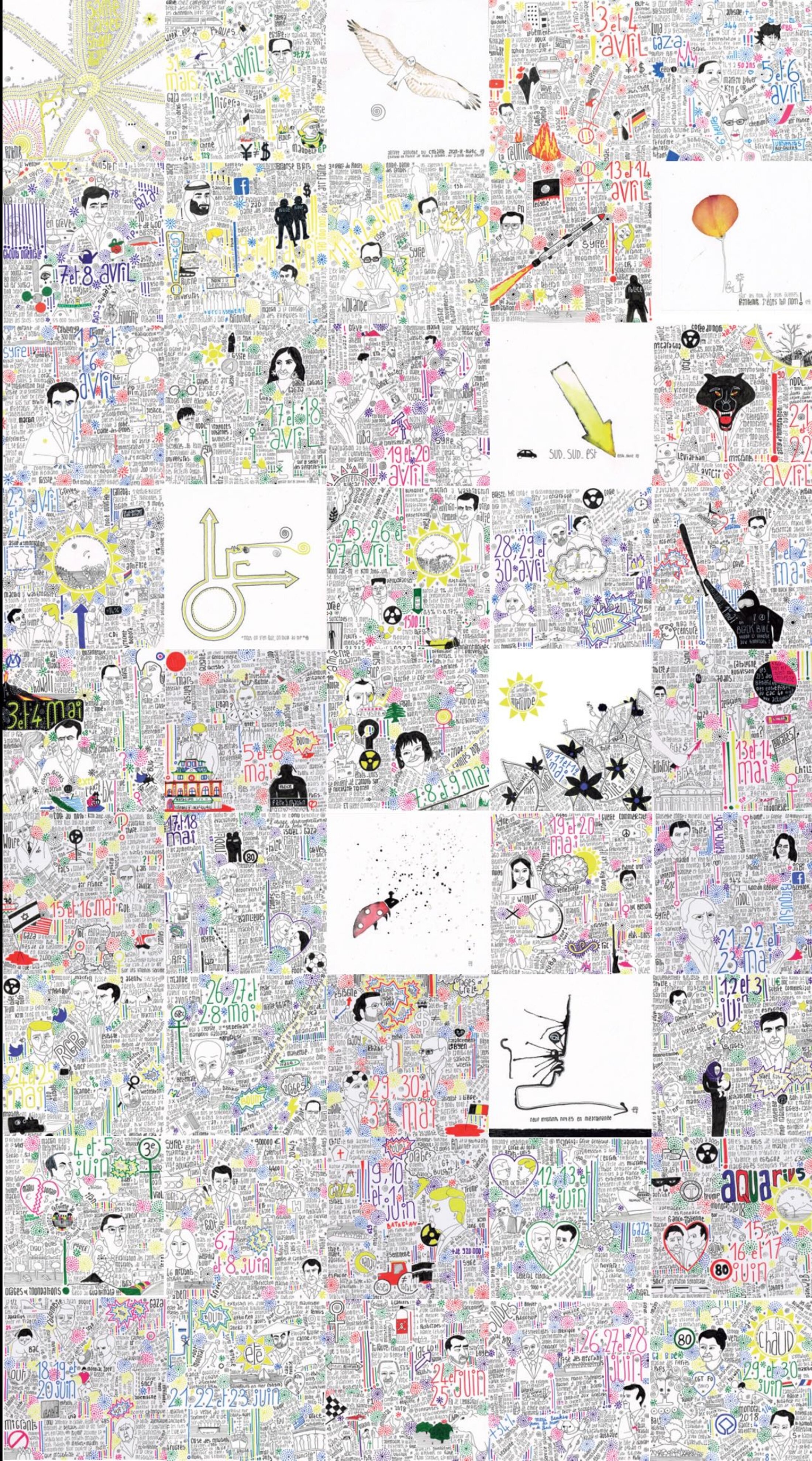 Zap Zap Actus - 1er trimestre 2018. 120x200cm - 60 dessins sur papier 20x20 © ARySQUE