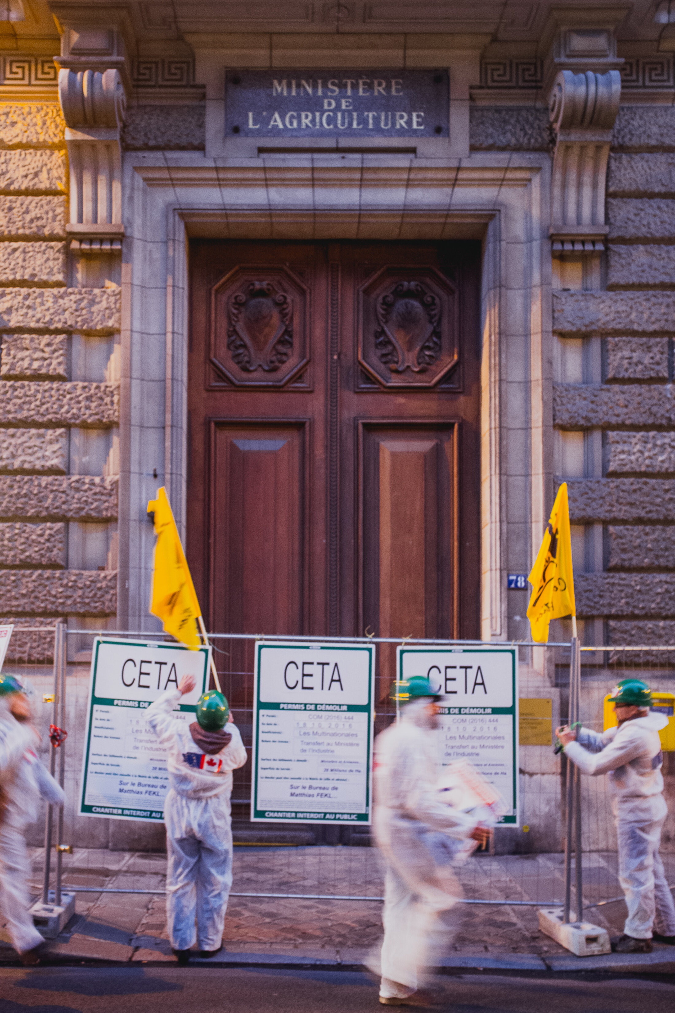A travers cette action, Attac, les Amis de la Terre et la Confédération paysanne dénoncent les effets dévastateurs du CETA sur l’agriculture. En effet, cet accord, dont la Commission européenne et le gouvernement français souhaitent une application « provisoire » dès cet hiver, entraînerait une accélération sans précédent de l’industrialisation de l’agriculture européenne.