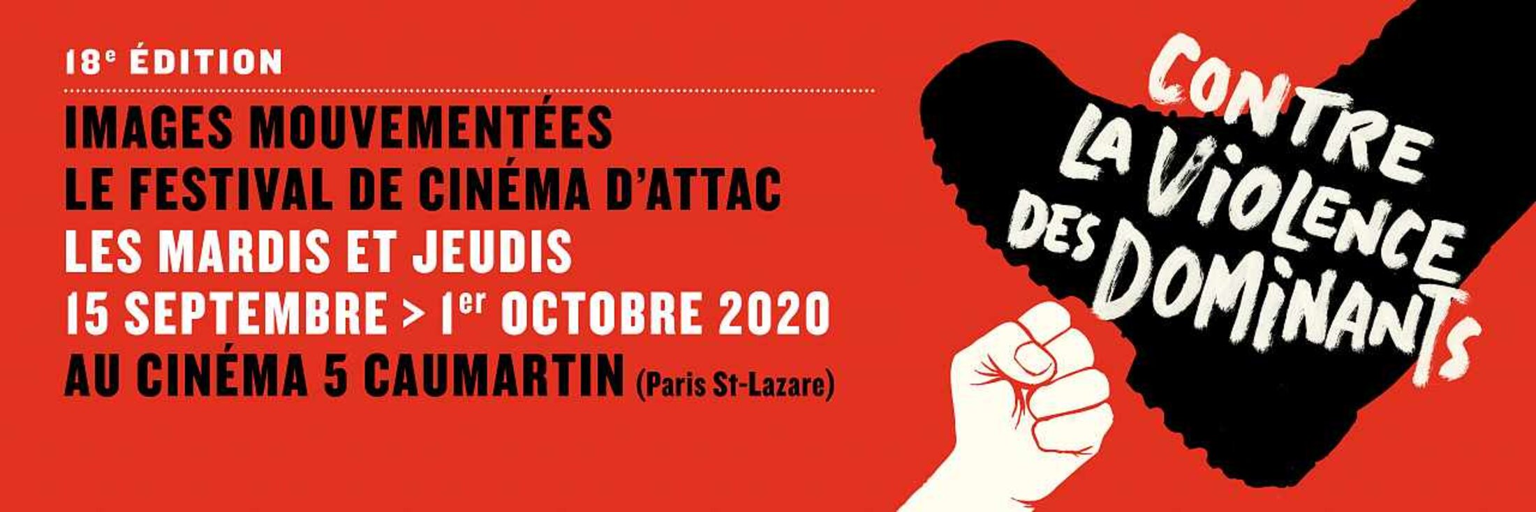 Parce que cette violence qui s’associe à la loi du plus fort nous apparaît inacceptable, nous consacrons la 18e édition du festival de cinéma d’Attac « Images mouvementées » à la dénoncer en images, avec une sélection de films forts, et à imaginer ensemble, dans le cadre des débats, comment la désamorcer durablement.