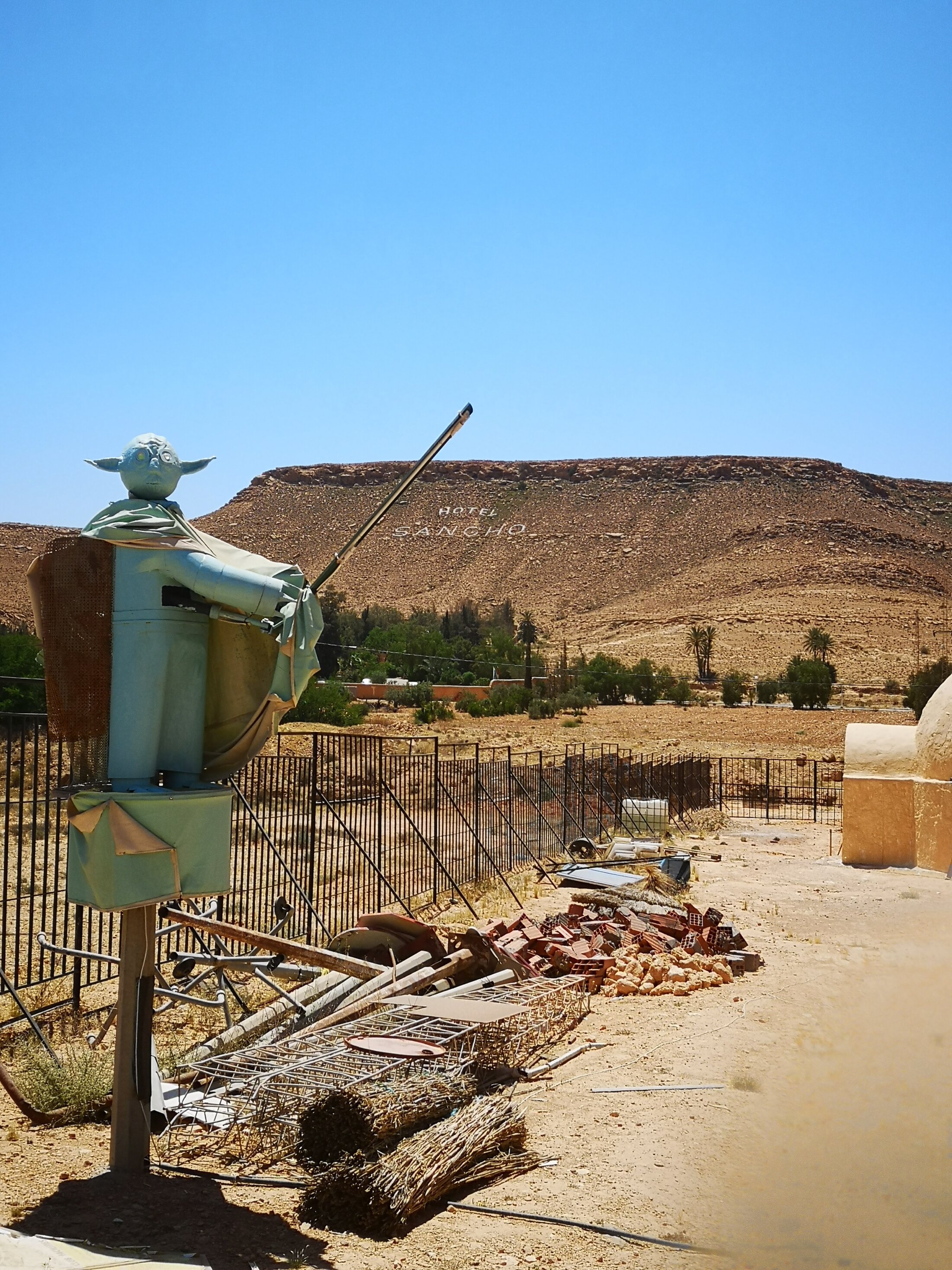 La route entre Djerba et Tataouine commence par emprunter la voie romaine qui relie l'île au continent, et qui offre un paysage marin pendant 7 kilomètres, avant de retrouver un décor agricole aux champs infinis d'oliviers. La route est belle, on jurerait que l'enrobé de la chaussée a été posé la veille ! Nous arrivons à Tataouine après plus d'une heure de route pendant laquelle nous n'avons vraiment pas croisé grand monde. Je propose à Afoul de s'arrêter aux abords de la ville pour immortaliser mon passage devant le panneau d'entrée, cette ville ayant un certain retentissement pour les fans de Star Wars d'une part, et jouit d'une très relative célébrité pour l'expression populaire qui y est associée. Nous ne nous arrêtons que pour faire quelques provisions dont la spécialité locale et sucrée "corne de gazelle". Avant de prendre la route vers Chenini, prochaine étape de notre voyage, Afoul souhaite me faire passer devant une maison un peu particulière à la sortie de Tataouine, qui jouxte l'accès à l'hôtel Sangho (que personne ne pourra rater puisqu'une immense enseigne est installée sur le flanc de la montagne, façon "Hollywood"). Un habitant a en effet transformé son terrain en musée Star Wars ! Ce "fan" de la première heure a recréé en extérieur, et certainement avec des objets de récupération du tournage d'origine, des éléments visuels des premiers films. Ses sculptures, faites de bric et de broc, des personnages Dark Vador et Maître Yoda, ainsi que l'igloo de Luke, sont les premiers marqueurs de la trace de Star Wars dans le paysage de Tataouine...Assez détonnant !
