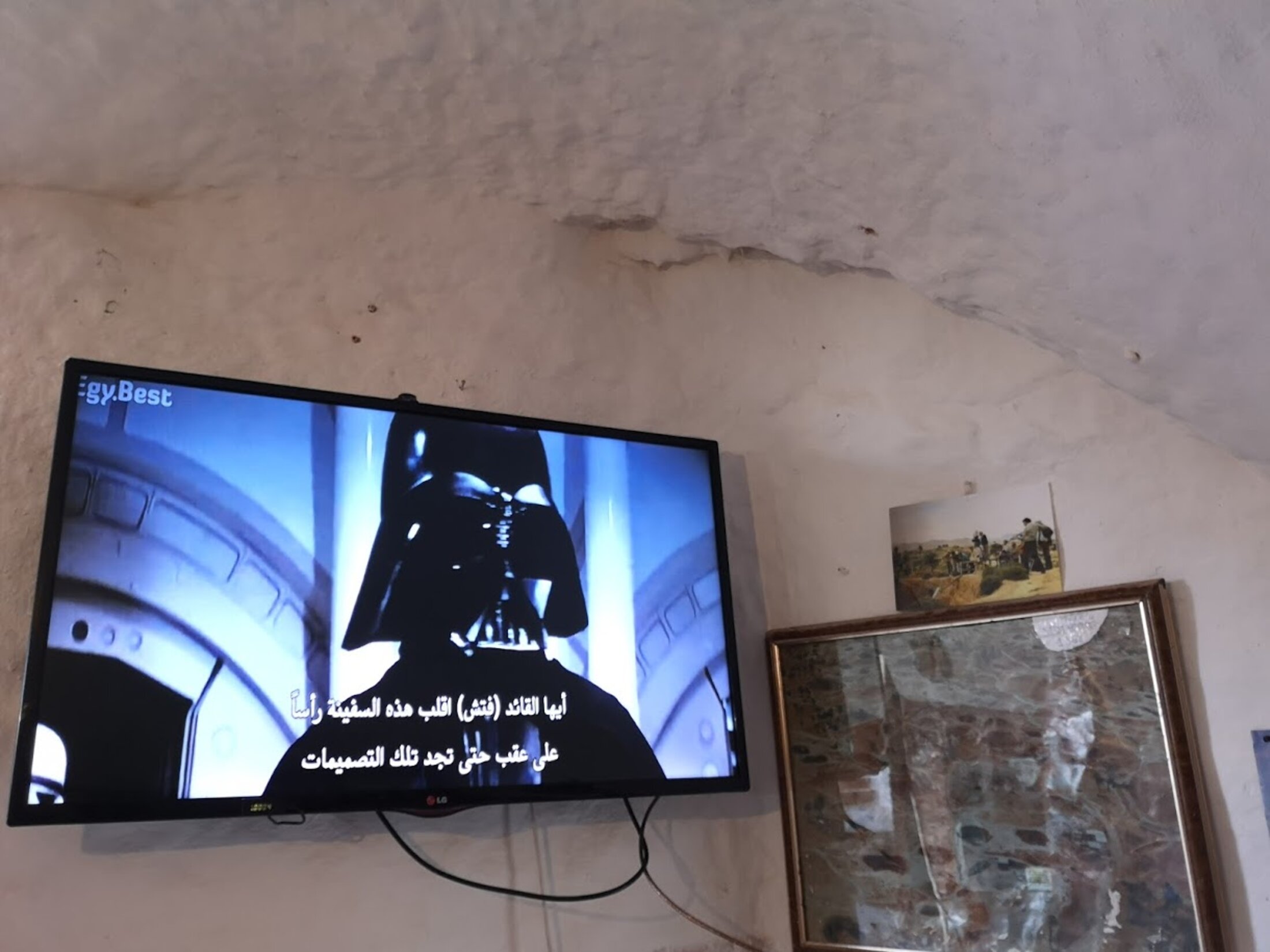 En route, cette fois ci c'est la bonne...et cette fois-ci encore, elle va être longue aujourd'hui ! On retraverse Chott-El-Jerid le désert de sel, on poursuit vers Douz...puis repas de nouveau dans la petite maison familiale...puis route vers Matmata, quelques auto-stoppeurs embarqués, des heures et des heures de route qui défilent et on arrive enfin à l'hôtel Sidi Driss où fut tourné l'intérieur de la ferme des Lars, avec notamment un plan en contre-plongée au dessus de ces maisons troglodytes, cette fois ci non pas creusées dans la montagne, mais dans le sol. Impossible de rater la référence à la saga ici, l'hôtel est LE lieu Star Wars de cette partie de la Tunisie. L'expérience de passer la nuit ici doit être mémorable pour chaque fan, mais plus encore : l'accueil et la déco à la sauce alien/stormtrooper dénote largement avec le cadre environnant. Le film est même diffusé en VO (sous-titré en arabe), et de nombreuses images, posters et produits dérivés du film sont accrochés au mur. Plusieurs touristes européens sont sur place. La frise au plafond de la salle à manger, élément remarquable dans le film, apparait largement sur les clichés des fans. Ah tiens, petite remarque qui me vient, il y a des sanitaires...pas du luxe pour ce genre d’excursions (pour info, j'en ai aperçu aussi au Ksar Ouled Soltane et dans le désert au Ong Jmal). Quant aux points de restauration, j'avoue n'en avoir vu aucun jusqu'à présent : mais j'avais prévenu plus haut dans cet article : partir sur les traces de Luke Skywalker, c'est une mini-aventure en soi et on laisse le confort des hôtels de côté. Sidi Driss n'a rien de remarquable pour autant, mais il est resté dans son jus et l'expérience de vivre le décor depuis l'intérieur est vraiment saisissante !