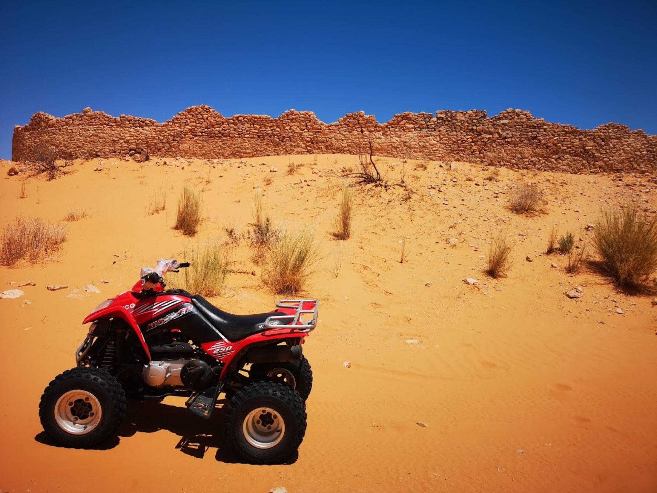 Que va pouvoir être le programme du 2ème jour si la moitié de ce qui était prévu a déjà été fait la veille ? Eh bien...de la route, et encore de la route ! Et des excursions non prévues avec quelques extras à payer. Afoul m'annonce que sur notre chemin vers Tozeur, se trouve un endroit où on peut faire du quad (m'en fous !), du dromadaire (pauv' bêtes !) et où on peut se baigner dans une source d'eau thermale au pied de l'oasis (sûrement sympa mais je ne suis pas là pour ça...). Vous aurez compris que ce genre de tourisme ne m'a jamais vraiment attiré... Ksar Ghilane est un haut lieu du "tourisme de désert" où on s'arrêtera donc pour que je m'essaye au quad, seul moyen de locomotion approprié qui pourra m'emmener dans les dunes semblables à celles traversées par les droïdes C-3PO et R2-D2 au début de l’Épisode IV... Moi qui ne conduit plus en France depuis une dizaine d'années, et qui n'a pas forcément une bonne image du quad, associé chez moi (métropole lilloise) aux rodéos urbains ou chez mes parents (ma Picardie natale) aux jeunes chauffards qui traversent les chemins de terre, j'avoue que l'expérience dans les paysages dunaires était incroyable et je ne regrette pas de m'être accordé ce petit extra après 2 heures de route sur piste. Car la route, elle, n'a pas changé pendant des heures...Si les paysages traversés sont à couper le souffle, faire de la piste au milieu de ce désert rocailleux en pleine chaleur n'était pas forcément ce qui était le plus agréable. L'arrêt à Ksar Ghilane était donc bienvenu. Plus étonnant, au milieu de ces dunes, un ancien fort romain que le guide en quad me présente comme..."Star Wars". Je souris intérieurement car je sais qu'il n'y a jamais eu de tournage ici d'une part, mais je m'interroge quand même...Cette affirmation pourrait passer facilement dans l'oreille d'un touriste lambda. La saga serait-elle donc ici un moyen d'attirer les touristes crédules alors que de l'autre côté de la Tunisie, sur Djerba, c'est tout l'inverse et c'est totalement ignoré ? La présence d'un fort romain du II ème siècle en plein milieu du désert n'est-elle pas déjà suffisamment digne d'intérêt pour qu'on en ajoute une couche ? Je ne suis pas candide à ce point même dans un pays étranger : soit le guide a été averti par Afoul de ce que je voulais voir...soit il a vu que je portais un t-shirt de la saga et s'est dit que ça me ferait plaisir d'entendre ça...mais si un jour on vous dit, comme ce guide me l'a dit, qu'il y avait eu un tournage Star Wars ici à Ksar Ghilane ou bien au Fort Tisavar, c'est tout simplement faux.