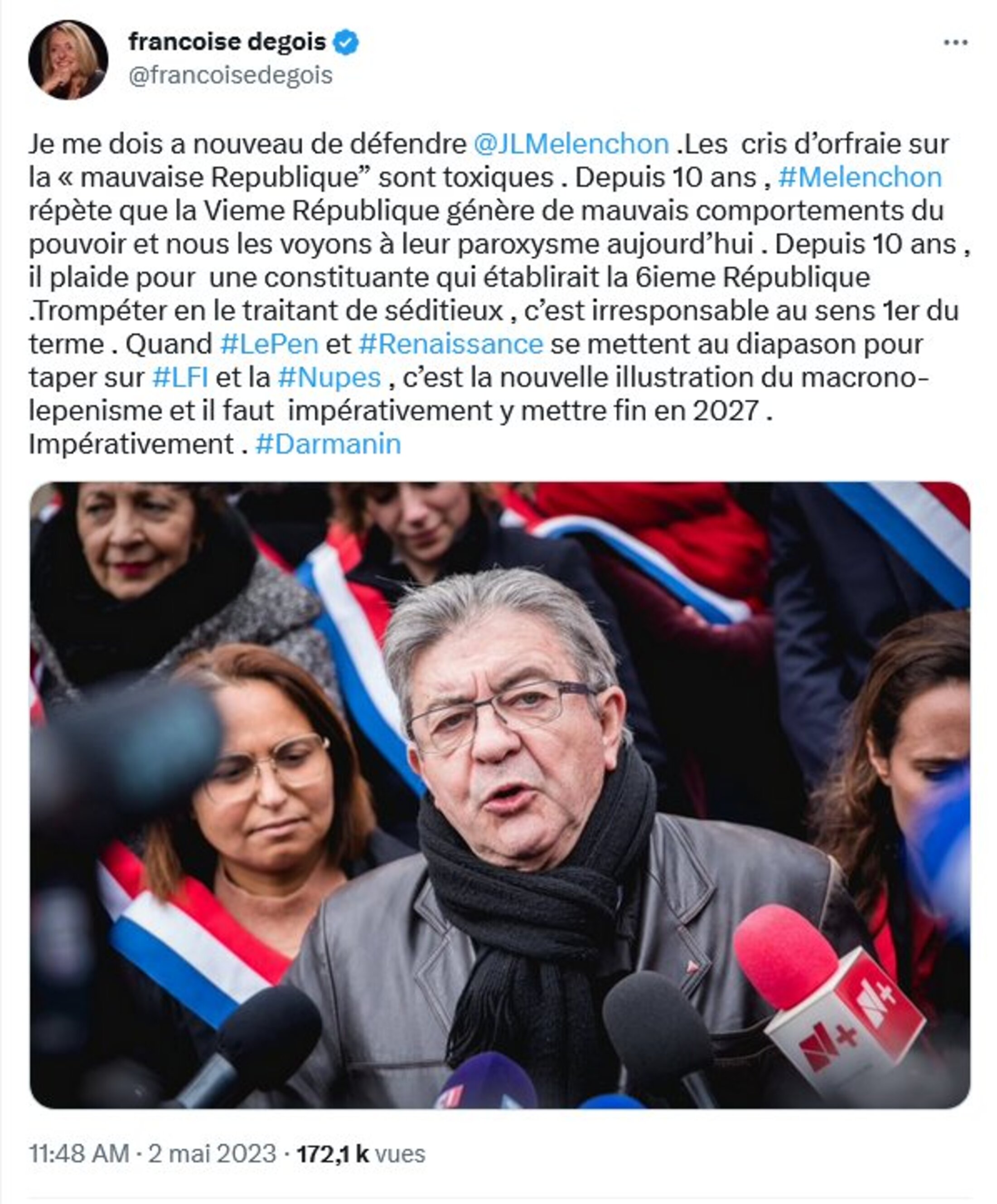 je me dois a nouveau de défendre  @JLMelenchon .Les cris d’orfraie sur la « mauvaise Republique” sont toxiques . Depuis 10 ans , #Melenchon répète que la Vieme République génère de mauvais comportements du pouvoir et nous les voyons à leur paroxysme aujourd’hui . Depuis 10 ans , il plaide pour une constituante qui établirait la 6ieme République .Trompéter en le traitant de séditieux , c’est irresponsable au sens 1er du terme . Quand #LePen et #Renaissance se mettent au diapason pour taper sur #LFI et la #Nupes , c’est la nouvelle illustration du macrono-lepenisme et il faut impérativement y mettre fin en 2027 . Impérativement . #Darmanin