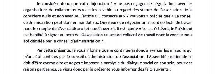 S’estimant victime d’un déni de démocratie visant à l’empêcher de poursuivre les négociations avec les syndicats de collaborateurs, Michel Larive n’entend pas céder aux injonctions de la questure. Dans un courrier en réponse, il soutient que les questeurs ne peuvent pas lui contester la possibilité de mener les négociations en vue de conclure un accord collectif avec les syndicats, puisqu’il s’agit justement du pouvoir que lui confèrent les statuts de l’association.