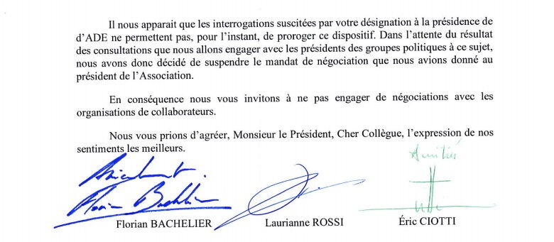 Dans une formule pour le moins surprenante, ces derniers déplorent “les conditions peu satisfaisantes de son élection en raison de l’absence d’une majorité des membres du conseil d’administration”, lors de la réunion du 6 mars. Le collège des questeurs décide alors unilatéralement de “suspendre le mandat de négociation” accordé au président de l’association. “Nous vous invitons à ne pas engager de négociations avec les organisations de collaborateurs”, intiment-ils à Michel Larive, en arguant des “interrogations suscités par [votre] désignation à la présidence de l’ADE”.