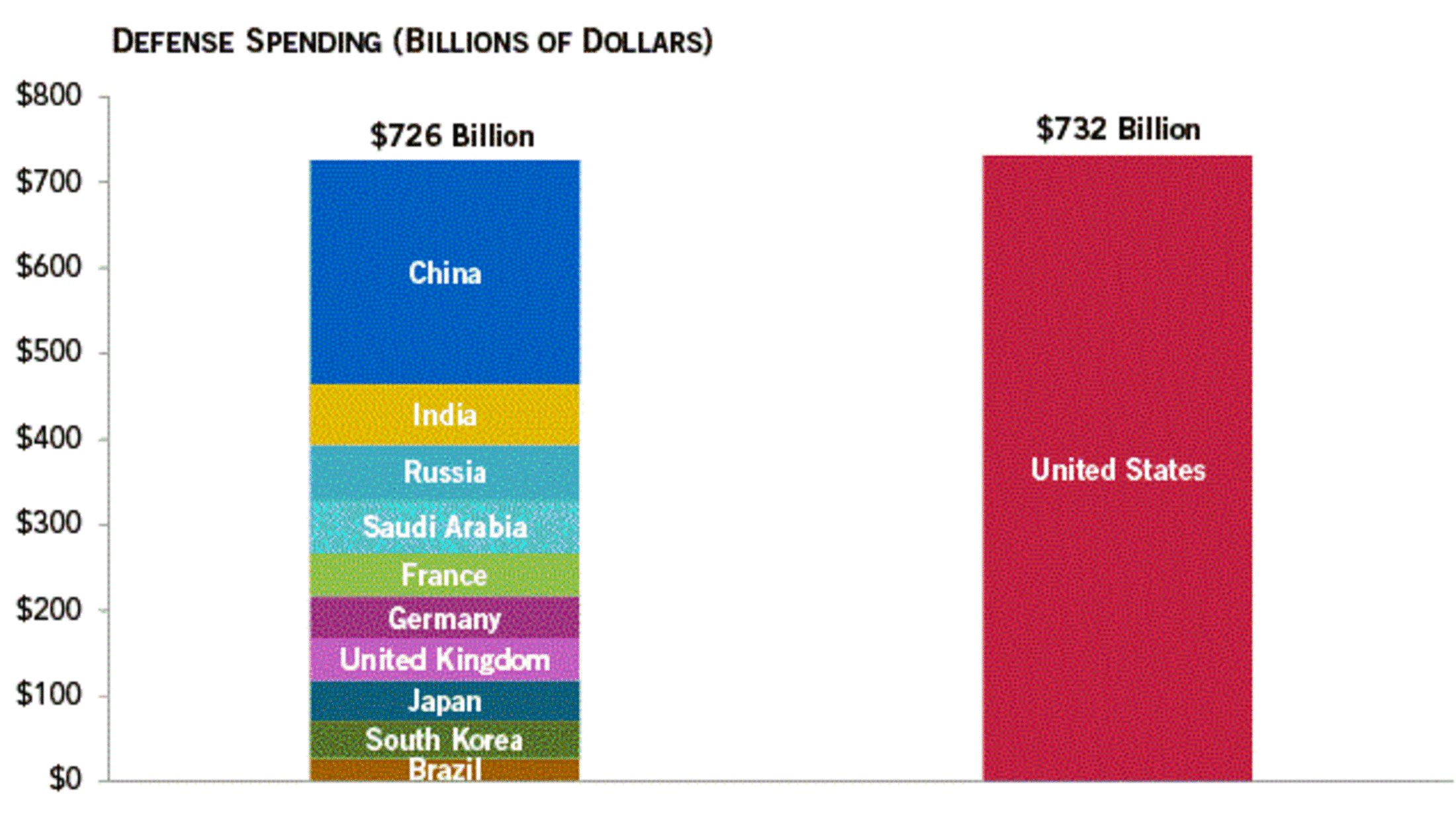 Les Etats-Unis sont aussi, et de loin, le pays du monde qui investit le plus dans l’armement. Si on additionne la totalité du budget militaire des 10 autres premiers pays du classement, Chine et Russie inclus, les Etats-Unis restent tout de même premiers. Probablement qu’ils ont besoin d’autant d’armes pour respecter les droits de l’Homme encore plus fort dans d’autres pays.