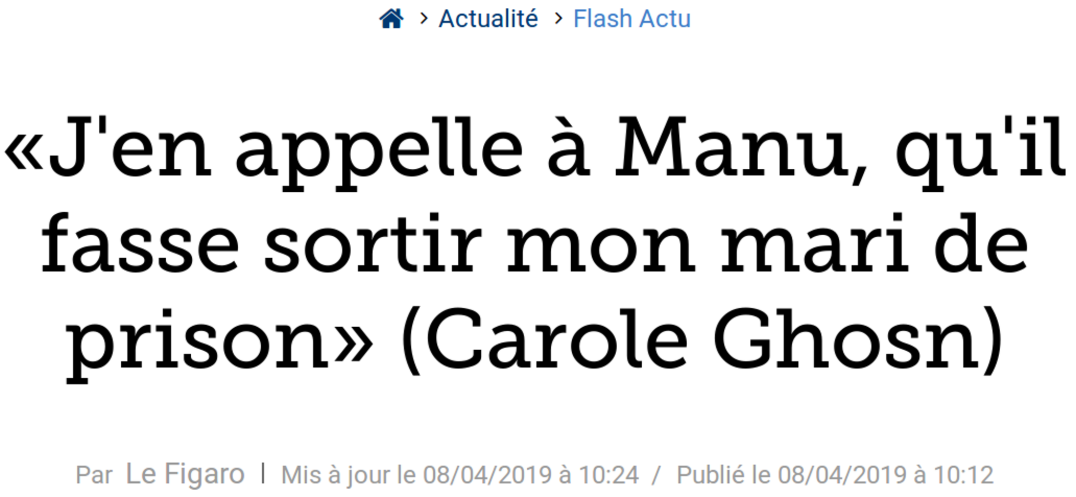 Invitée sur RTL ce matin, la femme de Carlos Ghosn en appelle à Manu afin qu'il fasse sortir son mari de prison : “J'en appelle à Manu qu'il fasse sortir mon mari de prison. […] La France est le grand pays des droits de l'Homme et maintenant, on ne sent pas qu'il y a des droits de l'Homme en France”.