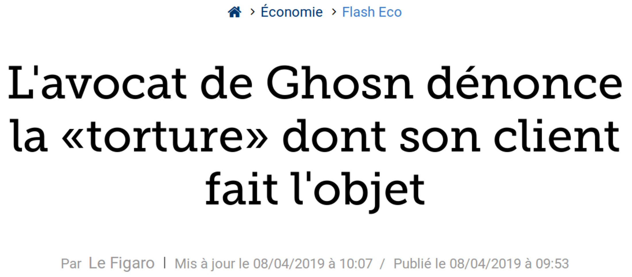 Ses avocats japonais “viennent d’écrire au procureur en chef du district de Tokyo pour lui demander instantanément et immédiatement de cesser de torturer Carlos Ghosn”, “Depuis qu’il a été ré-arrêté, il est interrogé 8 à 10 heures par jour alors qu’il refuse de parler sans la présence d’un avocat”.