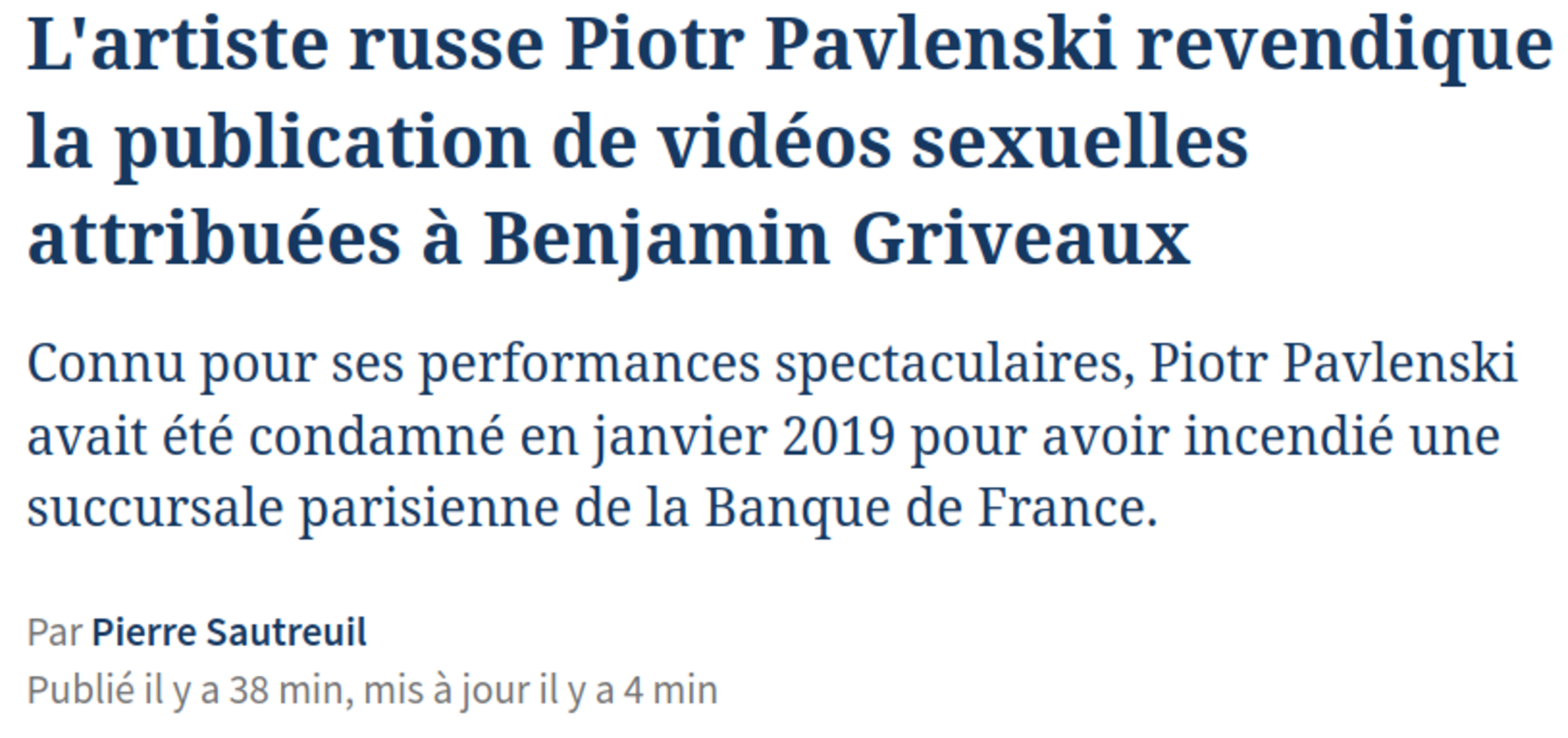 On peut être un artiste habitué des actions artistiques politiques et être choqué par le mensonge en politique. C'est ainsi que celui qui intitule ses actions de jolis noms comme Suture ou Carcasse et n'hésite pas se clouer le scrotum au sol de la Place Rouge pour dénoncer le fatalisme politique n'a pas supporté le Griveaux familial si éloigné du Benjamin déluré.