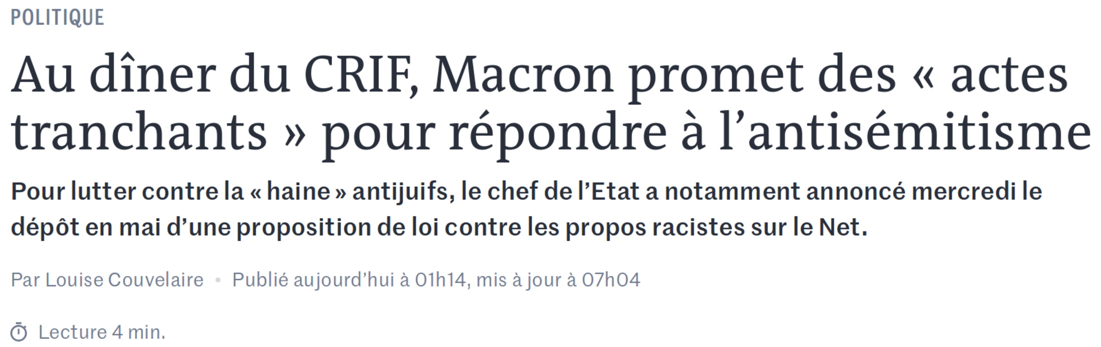 La France va adopter dans ses textes de référence la définition de l’antisémitisme validée par l’Alliance internationale pour la mémoire de l’Holocauste (IHRA), c’est-à-dire élargie à l’antisionisme, « une des formes modernes de l’antisémitisme ». Et cela sans pour autant « empêcher de critiquer la politique du gouvernement israélien » ni « modifier le code pénal », il s’agit de mettre en œuvre des recommandations (à destination des policiers, des magistrats, des enseignants…), les textes juridiques ne seront donc pas modifiés.