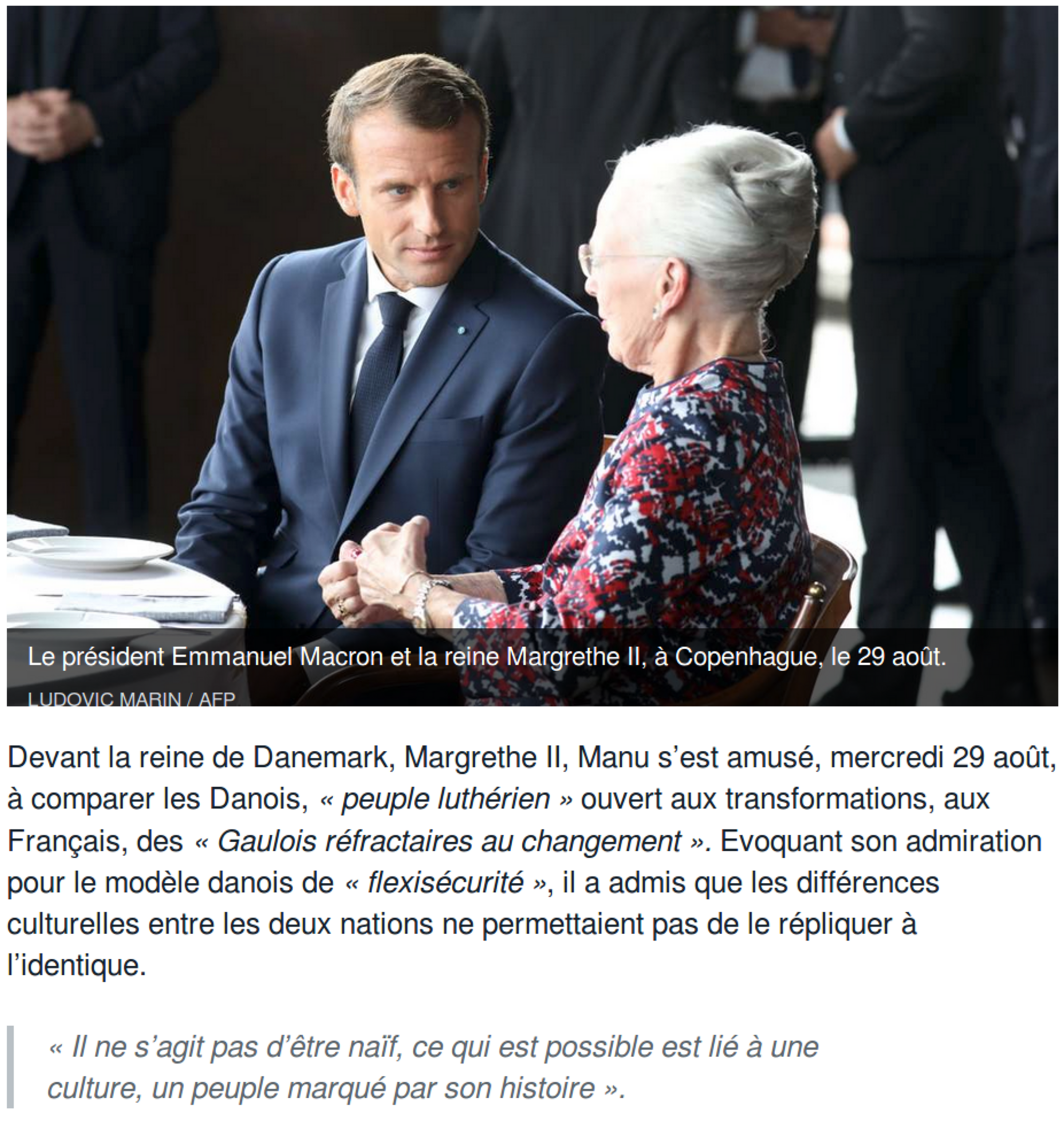 Comparer les Danois, « peuple luthérien » ouvert aux transformations, aux Français qui sont des « Gaulois réfractaires au changement » a permis de confirmer ce qui va rester de la « flexisécurité », les différences culturelles entre les deux nations ne permettant pas de la répliquer à l’identique. En Gaule, ce sera surtout la flexion. Quoi de plus normal au pays du président soleil...