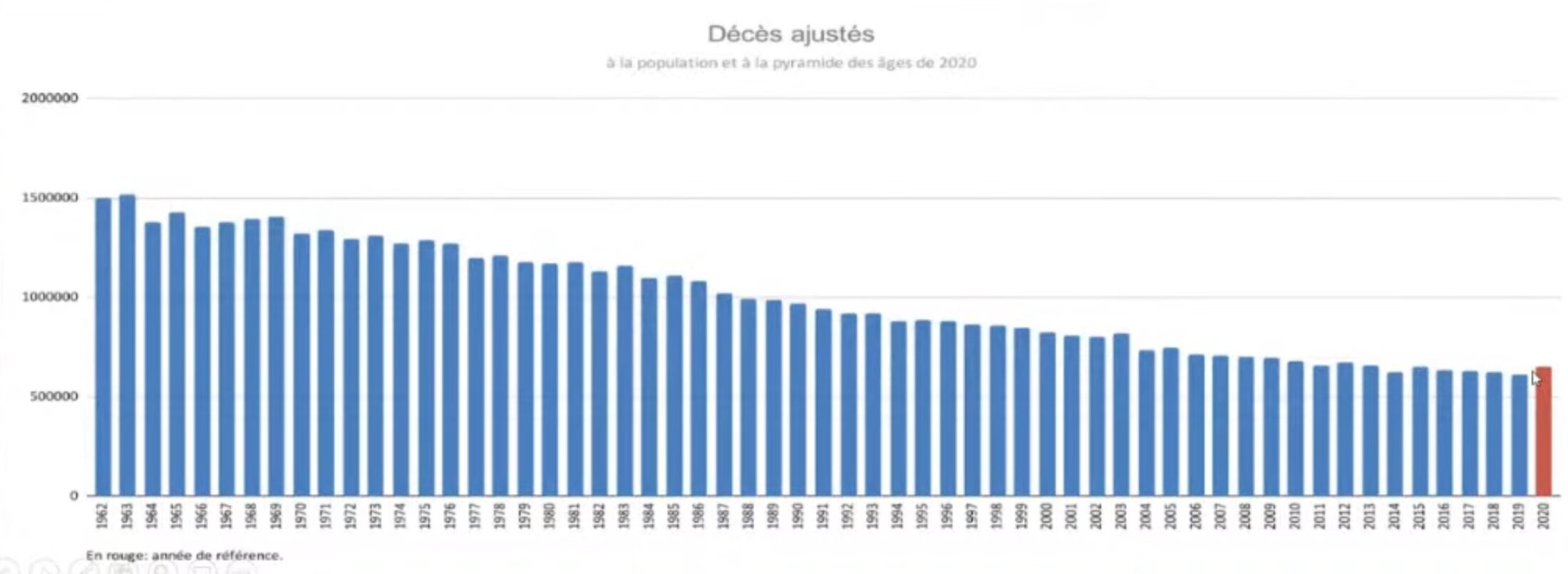 En économie, le calcul d’augmentation des salaires est toujours indexé à l’inflation, pour une comparaison liée au niveau de vie. Le principe est similaire si l’on veut jauger la progression d’une situation sanitaire, ce qu’a réalisé le statisticien, la pyramide des âges jouant le rôle de l’inflation : l’année 2020 (en rouge) est prise en référence, et les décès théoriques des années précédentes sont déduits par pondération, comme si la pyramide des âges était celle de 2020, mais en conservant la mortalité par tranche d’âge des années concernées.