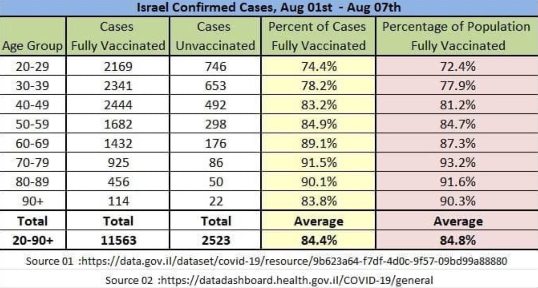 Selon les statistiques israéliennes des « cas confirmés » début aout, aucune réduction des infections ne ressort : la proportion de vaccinés infectés est très proche du taux de vaccination ( > 90 ans exceptés).