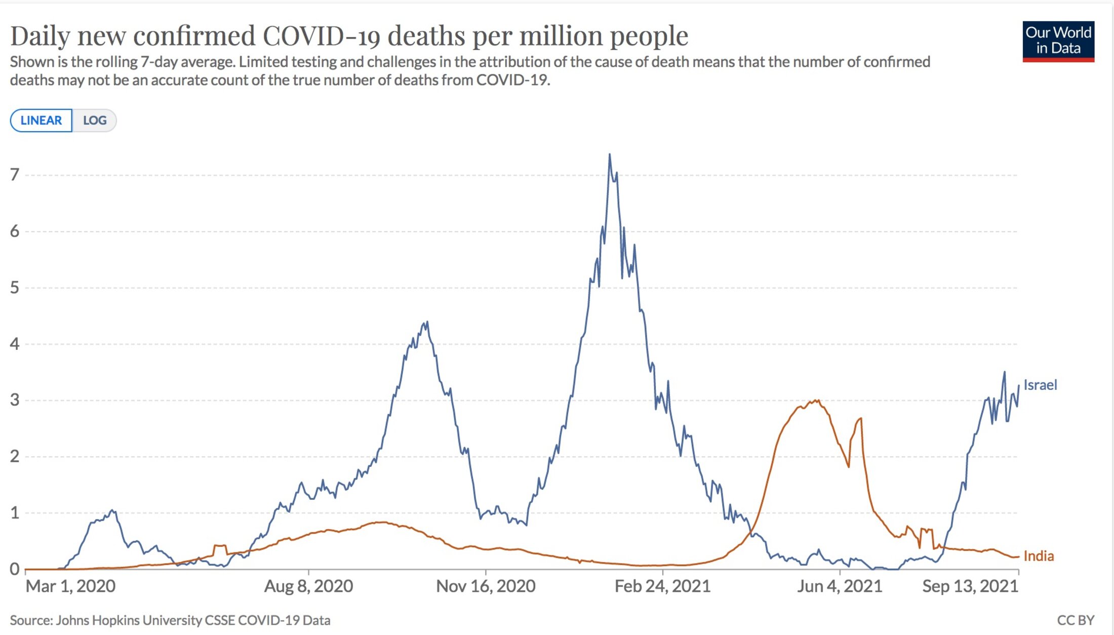 Le cocktail vaccin + pass n’a en tout cas pas épargné Israël, dont la mortalité se rapproche de celle d’automne 2020, malgré l’habituelle clémence estivale. Dans un monde rationnel, il n’en faudrait pas tant pour lever le pied et réfléchir ; par exemple, se demander pourquoi le berceau du variant delta, l’Inde, malgré une immunité naturelle très faible en mai, s’en est aussi bien sortie qu’Israël, sans vaccin, sans pass, malgré la promiscuité des mégapoles…