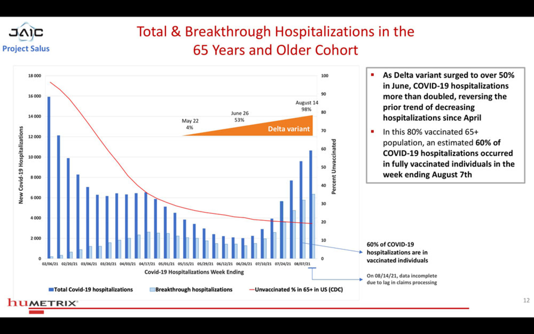 Pour la première semaine d’aout, le JAIC, institut affilié au département de la Défense (document complet ici), affirme que 60% des plus de 65 ans vaccinés sont hospitalisés pour Covid, avec un taux de vaccinés complets de 80% dans la même tranche.