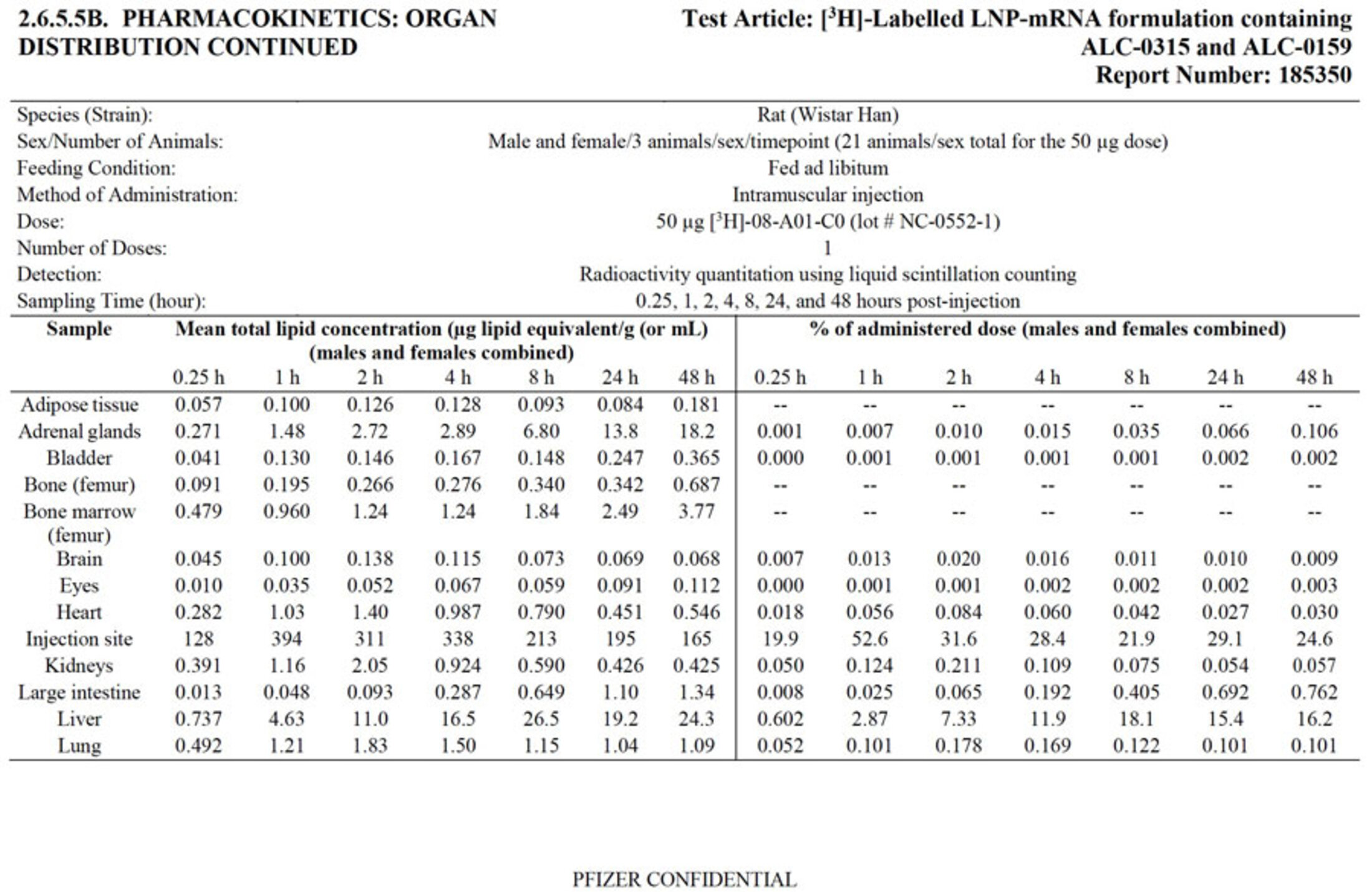 En deux phrases, ils se contredisent. Que ce soit 1% ou plus, ou moins, une portion se retrouve bien dans la circulation sanguine. La quantité d’ARNm d’une dose Pfizer serait grosso modo de 50 milliards d’unités, donc environ un demi milliard contenus dans 1% de produit. Mais aucune étude rigoureuse ne l’évalue précisément, l’agence européenne du médicament est claire : « Aucune étude traditionnelle de pharmacocinétique ou de biodistribution n'a été réalisée avec le candidat vaccin BNT162b2 ». Elle mentionne cependant l’étude 185350 de Pfizer, non conforme aux « bonnes pratiques de laboratoire » (“non-GLP“), restée confidentielle jusqu’à publication partielle au Japon.