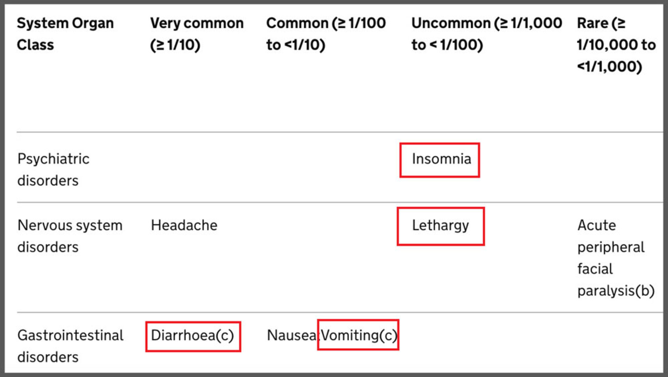 Les diarrhées sont très fréquentes ( > 1 pour 10 personnes), les vomissement fréquents. Pas banales pour un « vaccin », ces réactions peuvent pourtant signaler des troubles neurologiques sous-jacents, comme l’expérience dramatique de Maddie de Gray le suggère.