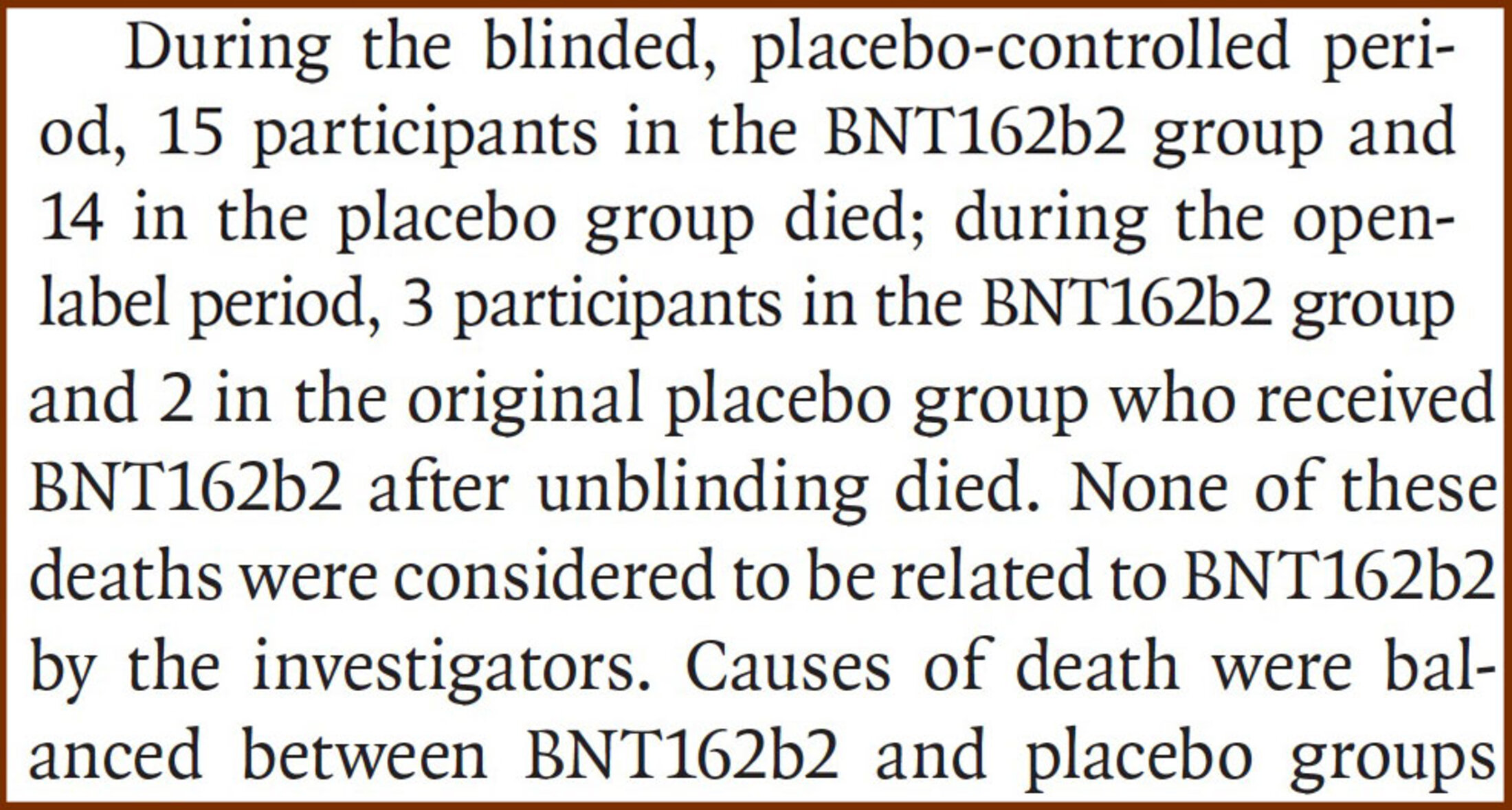 À six mois, il y a 25% de dècès toutes causes de plus dans le groupe vacciné. Les injections n’y sont pour rien, selon Pfizer ; un coup du sort. Cette période inclut la phase « open label », où le groupe placebo a été informé qu’il pouvait se vacciner, parmi lesquels deux néo-vaccinés sont morts. On sort donc de l’essai « randomisé » : les ex-placebo se faisant vacciner pour raisons individuelles, l’aléatoire est cassé.