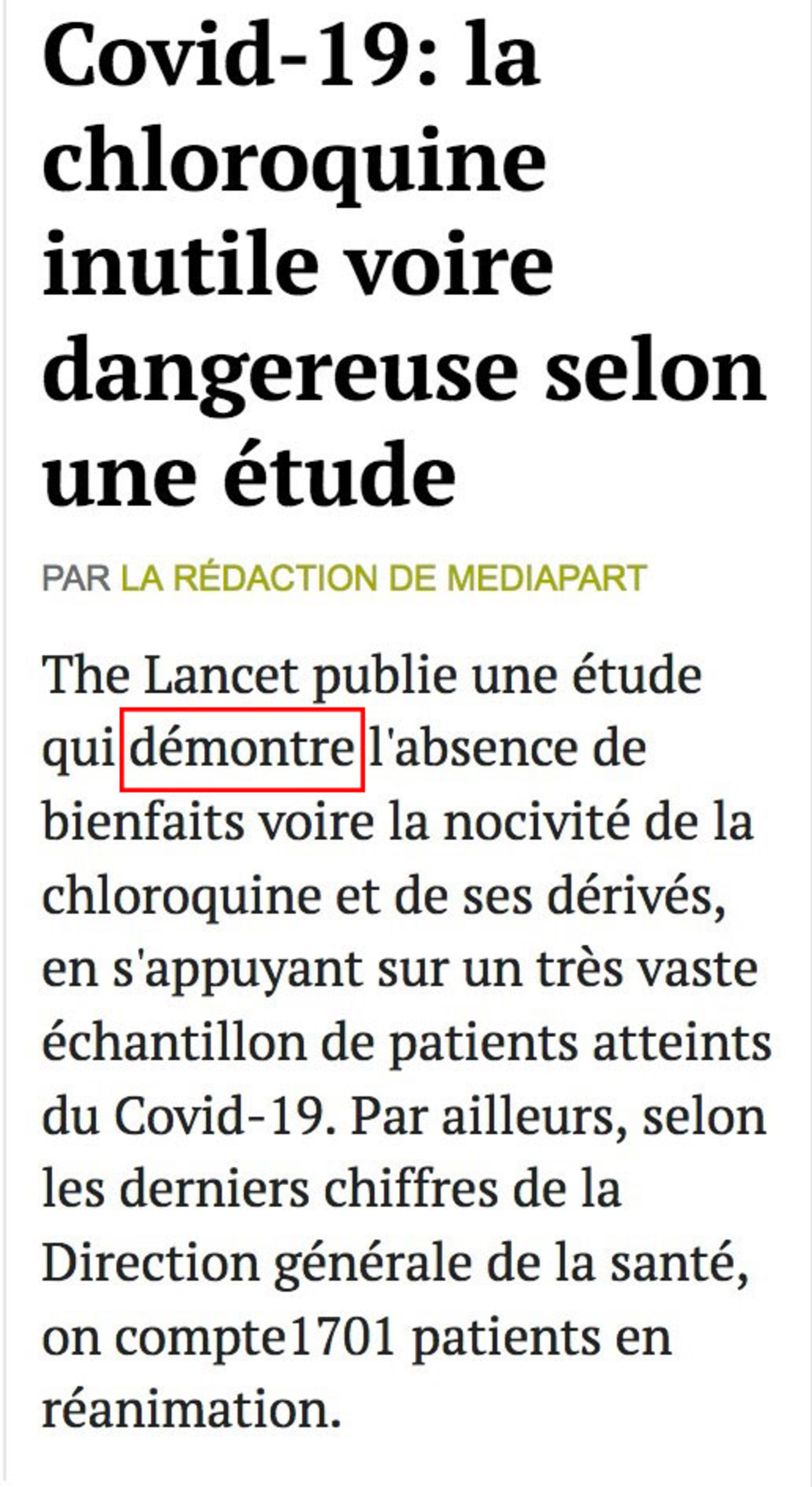 Alors que les experts reprochaient aux essais thérapeutiques de l’IHU de Marseille la carence de certains critères « scientifiques », aucun de ces experts ne reprochent à l’étude du Lancet l’absence totale de contrôle du suivi médical. Une montagne de chiffres aux faux airs scientifiques serait donc plus crédible qu’un essai effectué par une équipe médicale qui évalue, suit et soigne ses malades, répertorie elle-même ses observations dans un rapport (sur plus de mille patients dans le dernier en date de l’IHU, tout de même) qui l’engage nommément ?
