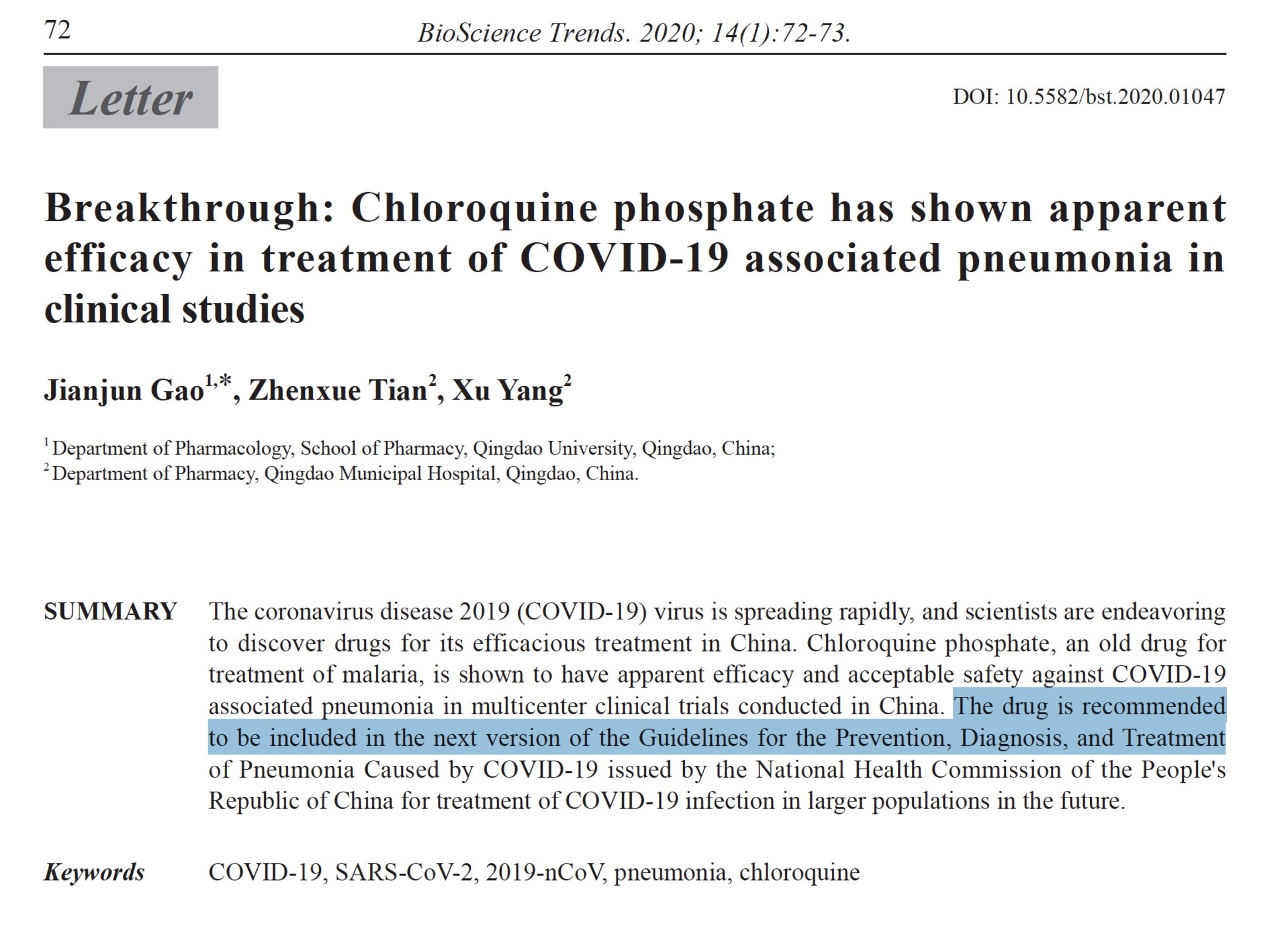La chloroquine est un médicament bon marché et sûr qui est utilisé depuis plus de 70 ans. À la lumière de la demande clinique urgente, le phosphate de chloroquine est recommandé pour traiter la pneumonie associée à la COVID-19 dans des populations plus importantes à l'avenir.