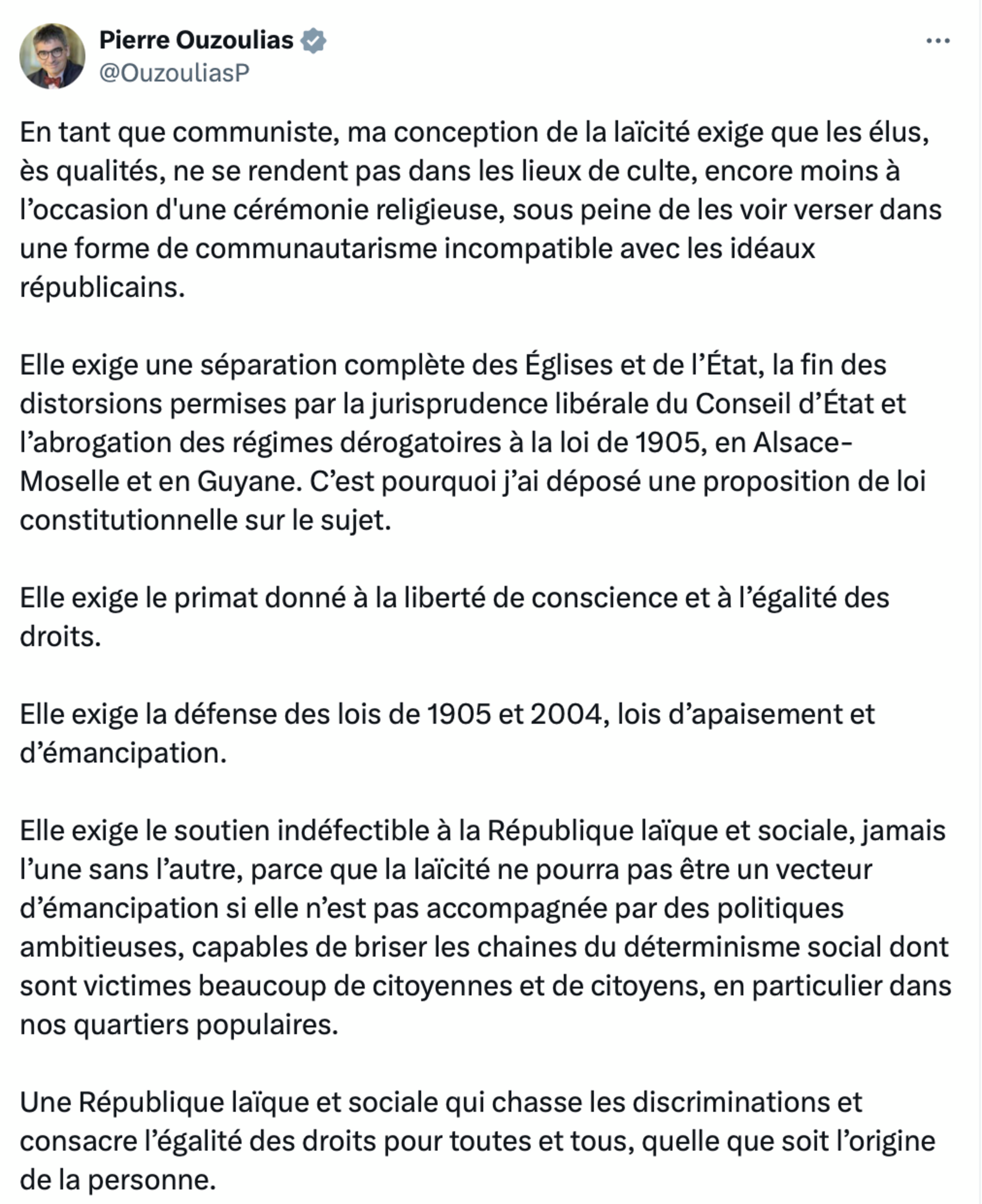 Je rappelle également qu’au moment de la loi « séparatisme », Alexis Corbière avait déposé d’excellents amendements proscrivant la présence d’élus, ès qualités, durant des cérémonies religieuses. Hélas, ces propositions ont été rejetées, faute de soutien, entre autres, des députés communistes.