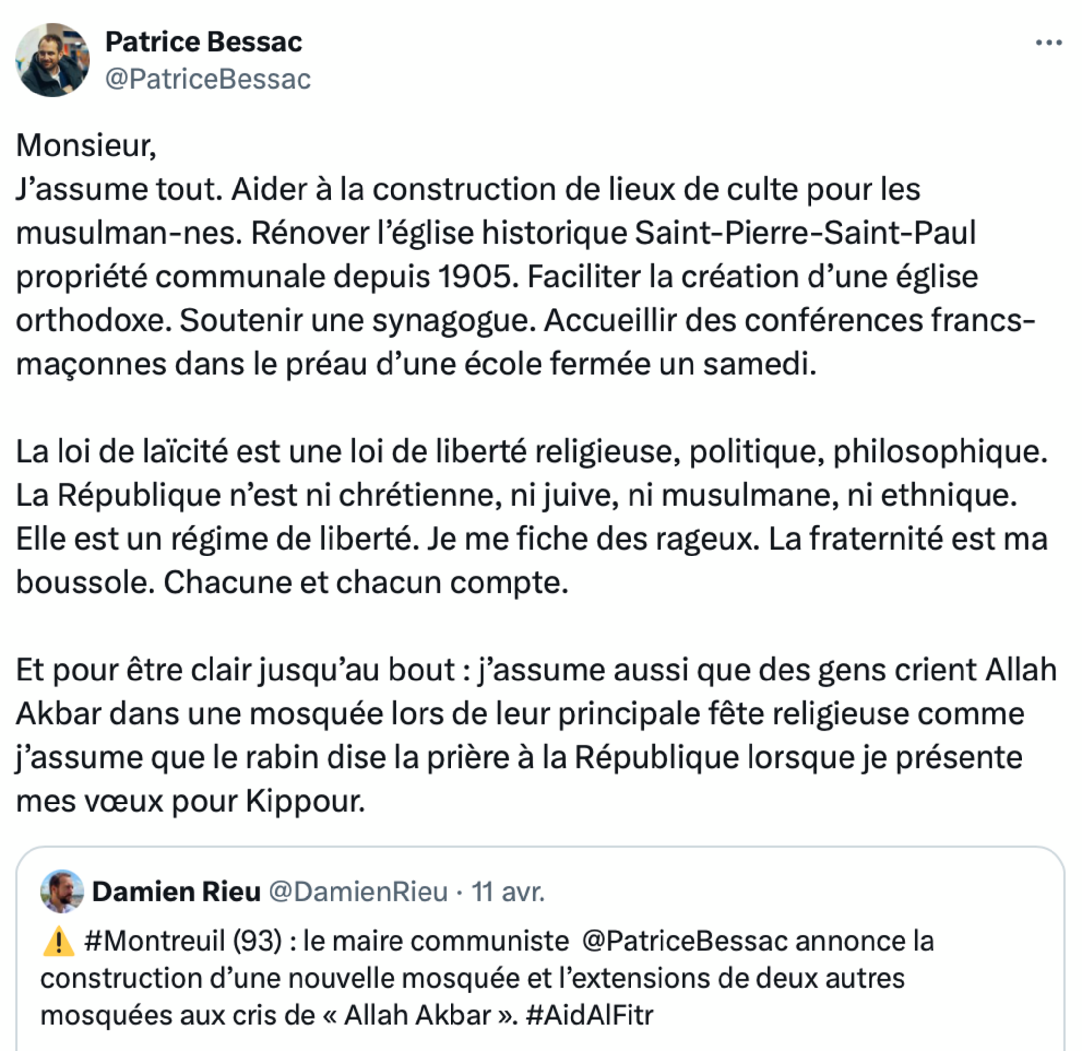 Puis ce fut au tour de Patrice Bessac, maire communiste de Montreuil, d’être filmé dans une mosquée — sans doute à son insu — après la prière de fin de ramadan, discourant sur les actions de la ville pour permettre l’extension de ladite mosquée et la construction d’un nouvel édifice, dans le bas Montreuil. La vidéo a été publiée par Damien Rieu, militant d’extrême droite, raciste notoire, qui s’est bien évidemment gargarisé de cette trouvaille, mettant en exergue les « Allah Akbar » prononcés par les fidèles musulmans entre chaque annonce faîte par Patrice Bessac.