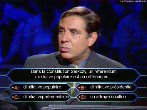 3. Que le peuple n’est là que pour soutenir l’initiative parlementaire (en fait, de l’UMP ou du PS) ; il n’a donc pas l’initiative de quoi que ce soit. Ce soutien est en outre situé à un niveau très élevé : 10 % du corps électoral, environ 4,5 millions d’électeurs inscrits sur les listes électorales, contre 1 à 2% en Espagne et en Italie (soit 500 000 signatures).