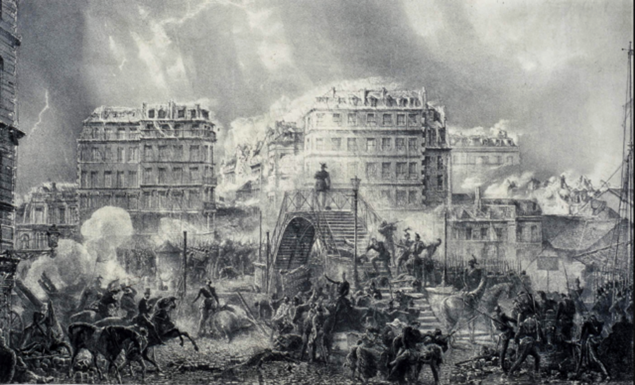 La colossale barricade barrant la rue du faubourg du Temple à la hauteur de la rue Bichat, autrement dite « la Scylla du Faubourg du Temple », celle de Barthélemy, gravée par Bonhommé qui nous en nomme les protagonistes : Au centre, le général Cavaignac, debout de dos au sommet de la passerelle ; en dessous, le cavalier Lamartine, tourné vers nous ; à la croupe de son cheval, le chef d’escadron d’état-major, Husson de Prailly, qu’on emporte sur une civière. À g., à l’entrée du pont tournant, le représentant Pierre-Napoléon Bonaparte, comandant la légion étrangère en Algérie, à côté de son cheval mort ; plus à g., derrière le cavalier portant la main à son haut de forme, l’officier d’état-major [Aynard de] Latour du Pin, grièvement blessé, tombant de cheval. Il n’y manque que Victor Hugo.