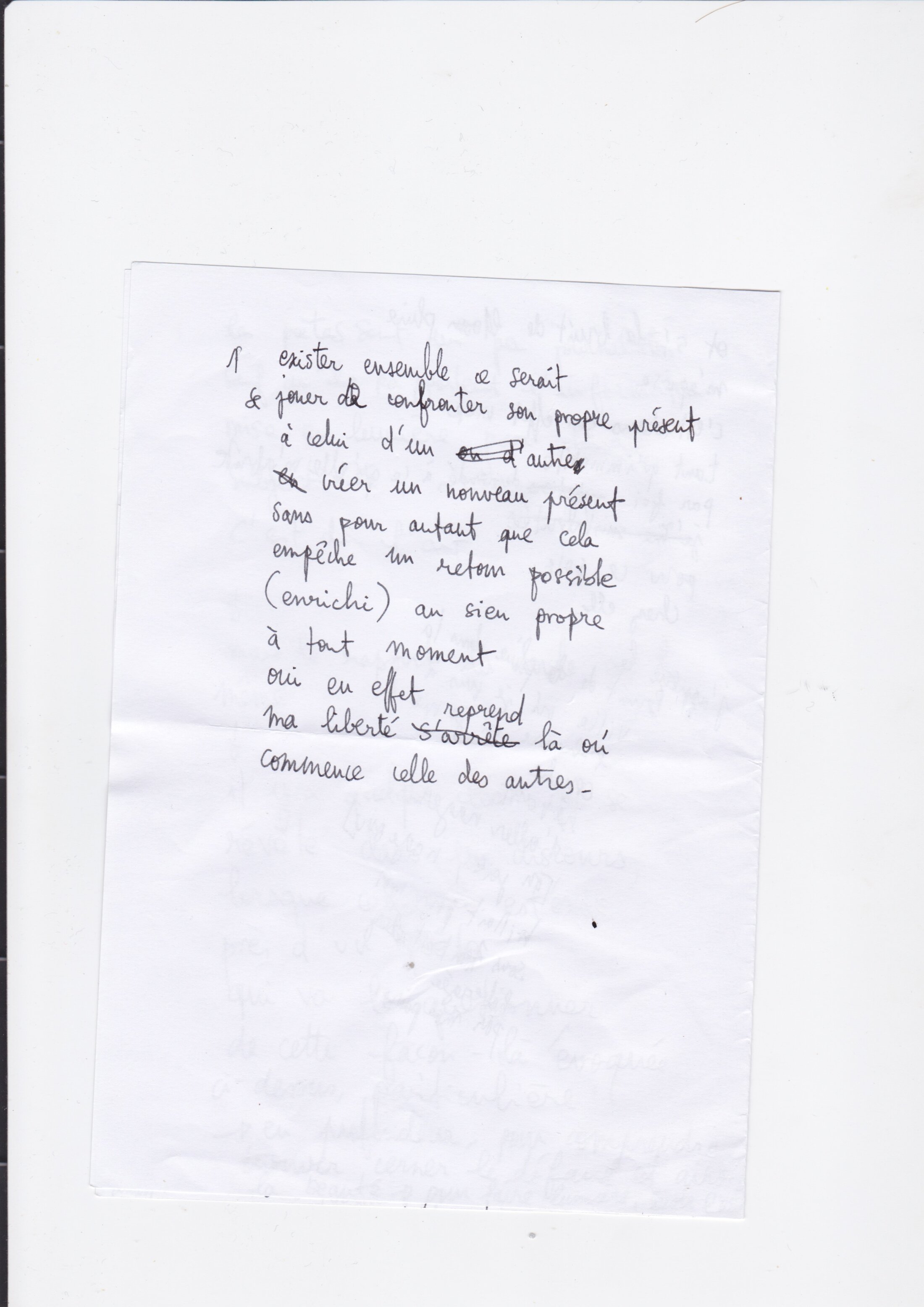[le culot de la voix de monoprix qui dit que si on habite à moins de 500m du magasin un livreur (pas une, hein) à pieds vient livrer gras.tuit. je comprends de penser à ceux qui ne peuvent pas ou plus se déplacer, je ne comprends pas d'oublier ceux qui ont parcouru les nombreux kilomètres les séparant d'ici, le culot de la voix du monoprix qui oublie que 500 maîtres, a priori, il faut se les considérer pour soi, et marcher, entreprendre de s'y frotter soi-même le plus souvent possible pour conserver sa propre liberté, son agilité (achilleté) le plus longtemps possible — et son culot toujours d'inventer le métier de livreur piéton dans un rayon de 500 mètres quand à l'intérieur du magasin il y a déjà plus de vendeur,euses que de client,e,s (ou d'honneure, de bonneheureuse — à mon sens) — les deux relativement passifs en ce sous-sol, avec une drôle d'idée de ce qu'un jour serait possible, sans s'aérer — créer l'essence d'un arrêt.é. L'hôtesse est mécontente à mon passage, comme si j'empêchais l'oeuvre, rangement, de se produire. J'ose un pardon madame ce n'est pas grave, ce n'est pas grave. Elle considère ma présence, cette fois-ci je ne suis plus superficielle à ses yeux (*superficielle et tous les jours il est question d'espace, naisse-pas) et elle dit gentiment (mais un peu plus haut que d'habitude me semble-t-il), qu'il faut que je fasse attention parce qu'elle, c'est un vrai danger. Coma dire je suis vaincue par vous, maintenant que vous n'êtes plus, superficielle à mes yeux. Alors je suis gênée et je lui dis qu'elle n'est pas un danger. Je repars chagrinée de ce qu'elle pense avec tout ce jour absent de sa journée et ses yeux devant des produits dont personne vraiment ne veut (on s'accorde tous pour dire que ce n'est pas très bon, finalement, c'est juste PLUS simple MOINS cher (et je me demande kiri ra le dernier avec cette logique car l'argent se place, et dépenser moins cher une conserve pour pouvoir payer plus cher un mcdo quand on sait que le prix d'un légume ou d'un fruit défie toute concurrence c'est quand même très incohérent) — et elle, qui se retrouve ici à trier cet or sale, avec tout son amour elle, qui arrive encore à désirer oeuvrer dans ce rangement. Je suis chagrinée et dépassée (pourquoi me dire ça à moi, qu'ai-je fait pour mériter SON poids ? ah oui, c'est vrai j'ai répondu à la première sorte d'agression, ce n'est pas grave, à cette première frustration qui avait pris l'informe de ma silhouette en ses nerds) alors je m'arrête et reviens sur mes pas et je lui dis, pour pacifier, avec en tête de nous remettre chacune, le pied à l'étriqué de l'équilibre précaire que je nous reconnais, vous n'êtes pas le danger. Je sais très bien que c'est le reste, ce cadre, votre employeur, le danger. On le sait très bien, regardez, cette façon qu'a la marque Monoprix de subtilement apparaître partout dans les rayons, le bio, regardez cette façon d'écrire, là , on le sait très bien. Elle dit ahouiouimais — je continue, regardez je sais très bien ce n'est pas vous le danger, regardez ce rayon-là, les produits comme ça [je lui montre les produits "bavards" de monoprix, le rayon contient environ 3 à 5 produits "bavards" monoprix sur 10], dans deux minutes, vous verrez, eux et les autres produits de monoprix, les "bavards" + "les p'tits prix" + "monoprix gourmet" + "monoprix bio", vous verrez d'ici l'année prochaine tout le rayon en sera rempli. Ce n'est pas vous le danger, je le sais bien, regardez, [je lui montre le rayon avec sandwichs et snacks "frais" (mon cul !) qui s'est récemment agrandi] je vois bien ce rayon-là prendre subtilement de plus en plus de place [on a l'air d'accord toutes les deux, comme une évidence pour dire que ça va pas, ce rayon sandwich est juste dégueulasse, on a l'air, sans se le dire, d'accord là-dessus. Et moi j'en ai pris un dans mon panier pour le prouver : il coûte 0,50 cts] on le voit, vous savez, c'est pas vous le danger, le danger c'est cette enseigne (*allons sang saigner) ce n'est pas vous ! Vous, vous, vous pouvez , il faut que vous — Restiez bien près de votre coeur. Oui madame. Bonne journée. Bonne journée. .Cela nous reste assez égal pour qu'après un échange intense on reparte tranquilles l'une l'autre. Et ce qui m'importe c'est surtout de ne pas avoir laissé passer ce mot si furtif et si énorme de quelqu'un qui disait qu'il était un danger. Du danger que représentait une hôtesse de vente en train d'exercer le travail pour lequel on l'engage et à cause duquel elle rate un peu du jour [combien de temps encore ?] qui me dit c'est-à-dire, d'elle-même, qu'elle est un danger. Si les mensonges des hommes politiques passent parce qu'on n'est pas directement devant eux pour les confronter à leurs vérités, et que je veux que cette situation change, alors j'attaque les mensonges qui permettent de croire à la fin dans cette impossibilité à exister sincèrement et.ou en se consacrant à l'honnêteté [d'une pratique ou d'un sentiment] avec fierté. Ainsi j'attaquerai le mensonge à mon échelle et depuis mon point de vue dès que l'occasion se présentera. J'ai pris mon courage et mon ridicule, je les prends à deux mains ce jour car oui, il est nécessaire (nécessaire) de dire et d'entendre, oui, et je réponds à la personne que je ne devrais pas juger car son existence m'est finalement bien égale qu'en tout cas je suis sûre, que j'ai une confiance absolue dans le fait qu'elle ne soit pas, un danger. Je ne la confonds pas avec ce mot de mal. Et d'ailleurs ce n'est pas le mal le mal, pour moi c'est le secret, le silence, où peut s'enraciner la peur. Le culot de la voix de ce robot humain et son livreur piéton qui baisent en ce désert — VS — le culot de l'hôtesse, et le mien, nos pieds ont senti de s'épier, avons formé amour, tranquilles, nous qui ? nous sommes surprises, deux (et delles), sans-tu ou terre, racine et feuille 
